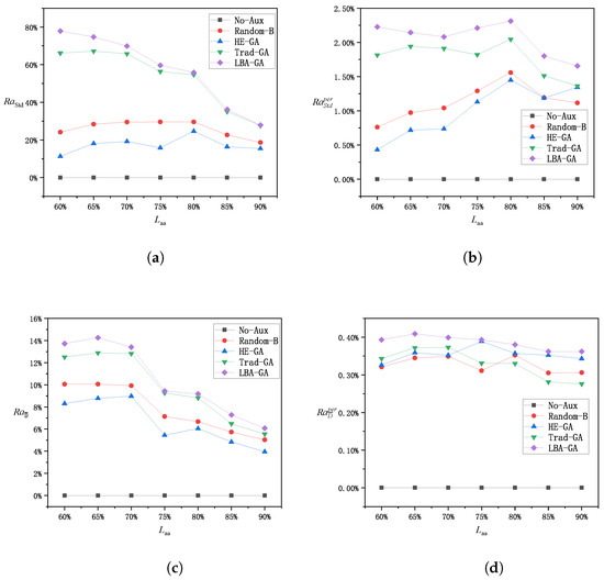 - Load-Balancing Optimization Rate (): It is measured by the standard deviation reduction ratio to indicate the effectiveness of the method in terms of load balancing.where represents the overall standard deviation of the No-Aux method and represents the overall standard deviation of the current method.