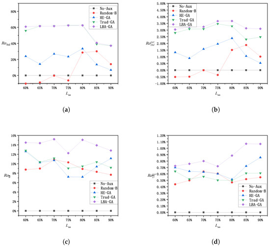 The overall optimization level of each method in terms of delay is demonstrated in Figure 7c and Figure 8c. For Dataset 1, as increases, the need for auxiliary edge servers increases and the operational space for the algorithm is reduced, resulting in a gradual reduction in the overall optimization of the delay. In contrast, in Dataset 2, the overall delay is less sensitive to changes in . The LBA–GA method generally outperforms the other methods in terms of average improvement across different values and holds a more significant advantage.