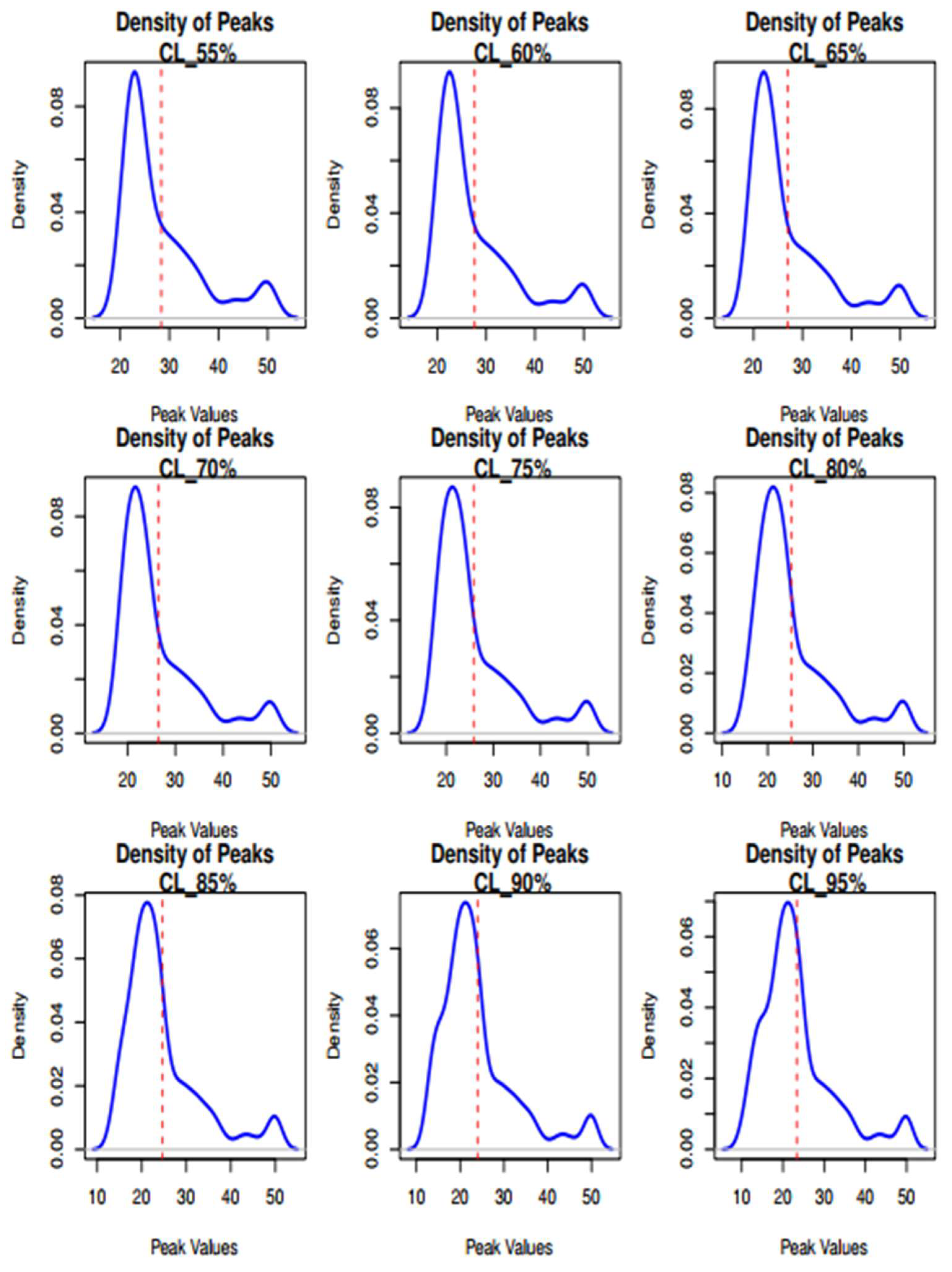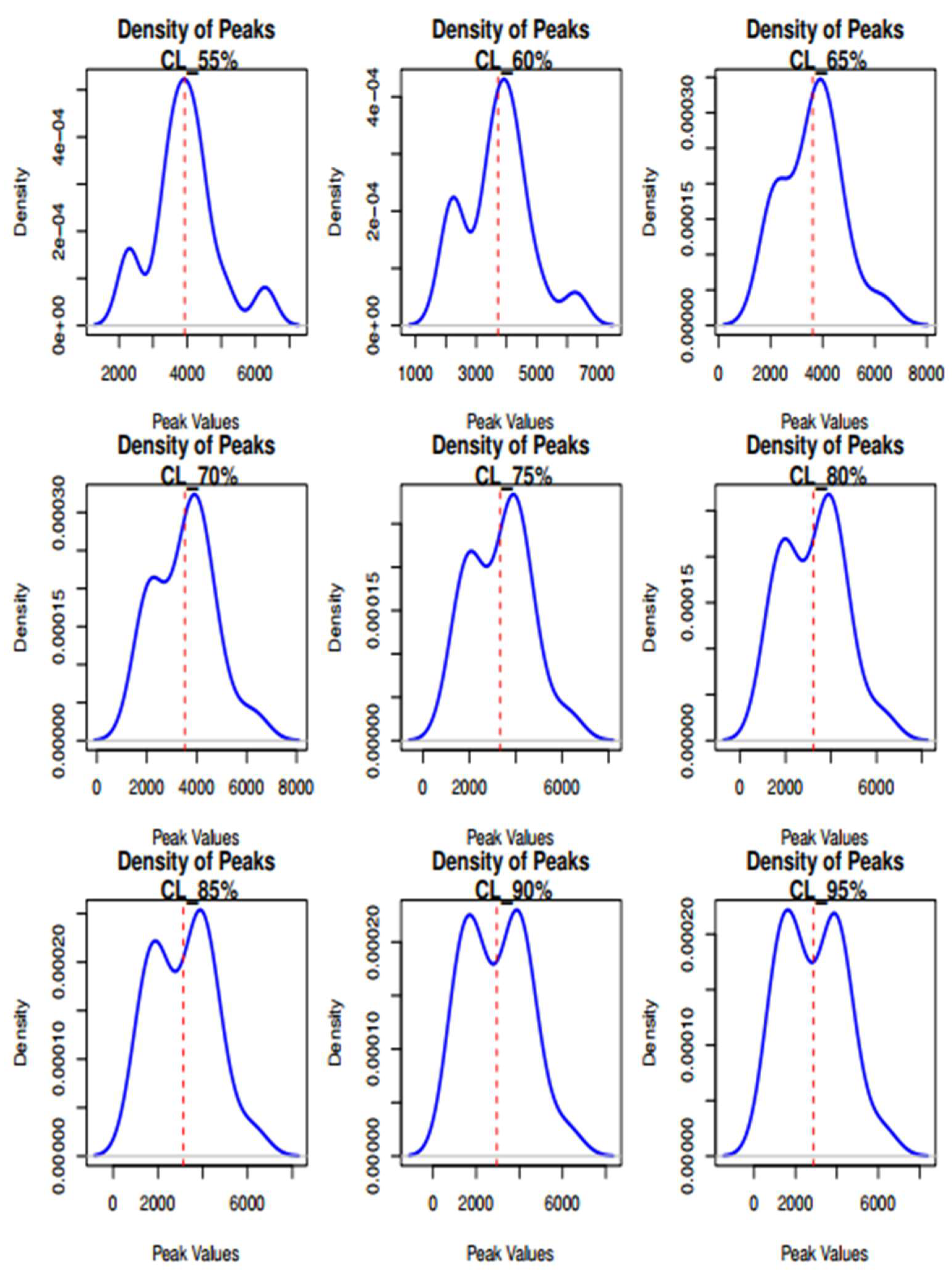 - For the set of peaks identified in step 3, calculate key descriptive statistics:
