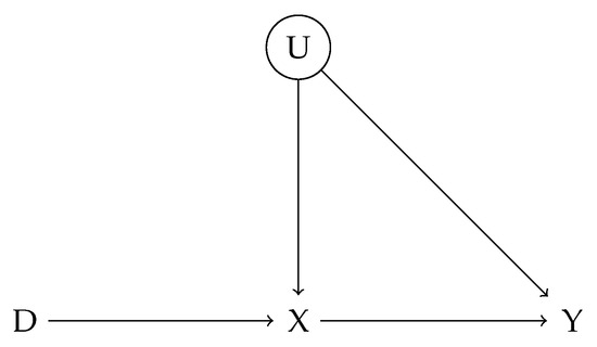 The DAG in Figure 1 depicts a noncompliance experiment in which an unmeasured confounder U simultaneously influences both the treatment variable X and the outcome variable Y. In this model, the instrumental variable D affects whether an individual receives treatment by influencing the treatment variable X, which in turn exerts a direct causal effect on the outcome variable Y.
