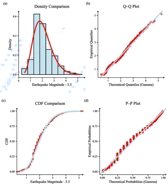 Diagnostic plots for the fitted truncated Gamma distribution to the magnitude of earthquakes above 4.0 in China (1970–2019). (a) Histogram of the sample data and the probability density function (PDF) of the fitted distribution (red line); (b) Quantile–Quantile (Q–Q) plot, where points closely following the diagonal line indicate a good fit between the empirical and theoretical quantiles; (c) Comparison of the empirical cumulative distribution function (ECDF) from the data (red line) with the theoretical cumulative distribution function (CDF) of the fitted distribution (blue line); (d) Probability–Probability (P–P) plot, where the alignment to the diagonal suggests the model adequately captures the data distribution.