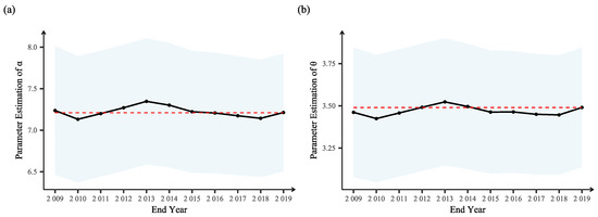 For the parameter stability test, we initiate with a 40-year data window. Equation (29) is then refit annually as the window rolls forward one year at a time. Figure 2 plots the evolution of the parameter estimations over this period. The Gamma distribution parameters, and , exhibit remarkable stability throughout the sample period. This provides strong justification for using the full-sample data for a single, static model fitting in our main analysis.