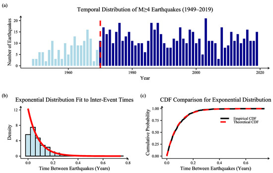 For the empirical analysis, we collect data on all earthquake disaster events in mainland China (excluding Hong Kong, Macao, and Taiwan) from 1949 to 2019, excluding events with epicenters at sea or outside the national borders. The dataset used in this study was obtained from the China Earthquake Networks Center (http://data.earthquake.cn (accessed on 1 June 2023)). All selected earthquakes have magnitudes of 4.0 or greater. Given the generally positive correlation between earthquake magnitude and economic losses, earthquake magnitude is adopted as the trigger variable in the design of the earthquake CAT bond.