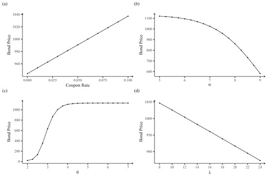 Figure 8b,c explore the effects of changes in the Gamma distribution parameters. The sensitivity to the shape parameter is nonlinear and pronounced: as increases, the bond price declines at an accelerating rate. For the rate parameter , the bond price shows a steep but decelerating increase for , eventually plateauing when . These patterns highlight the role of the loss severity distribution in determining the probability of triggering payouts at high thresholds. The observed sensitivity to is closely tied to the specific payout design employed in this study.