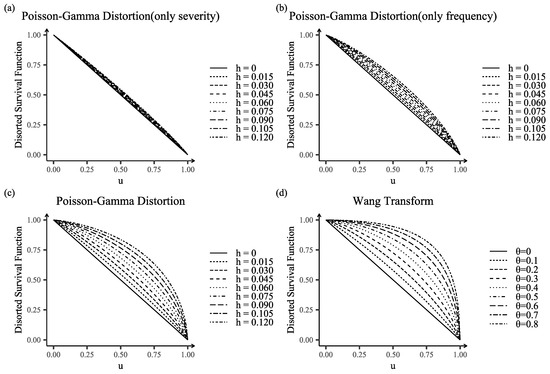 When , the larger the value of the parameter h, the thicker the tail of the distorted density function. Based on the characteristics of catastrophic events, this article only considers the case of . Therefore, after the Esscher transform, the cumulative distribution function of X on the measure can be expressed as