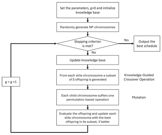After all mutations are applied, the newly generated chromosomes are evaluated. A greedy selection strategy is then used to update the population: each original chromosome is replaced by the best-performing offspring in its subset, but only if the offspring achieves a lower makespan. Figure 1 presents an overview of the KGGA. The following parameter values were employed: NS = 10, S = 7, = 0.1, and NF = 5. The stopping criterion involved reaching a maximum number of generations set at g = 1000.