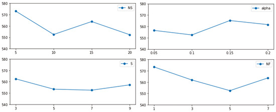 Figure 2 illustrates how different parameter values influence the average makespan. Based on the DOE results, the optimal configuration was identified as NS = 10, S = 7, , and NF = 5.