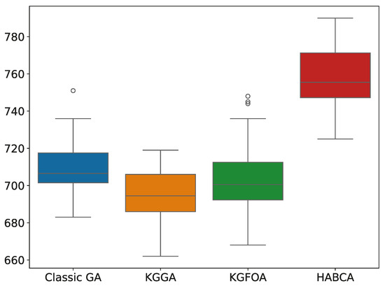 Moreover, the KGGA demonstrated consistent high performance across runs, with no extreme poor-performing outliers observed. This consistency suggests a well-balanced interplay between exploration and exploitation, as well as a strong ability to escape local optima. Lastly, the HABCA was consistently outperformed by all other algorithms, indicating limited competitiveness within the tested benchmark scenarios.