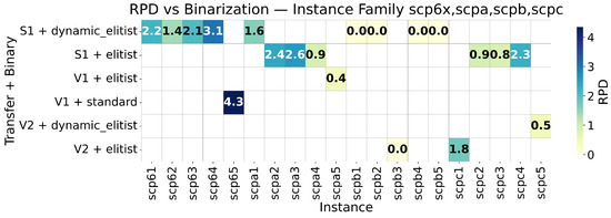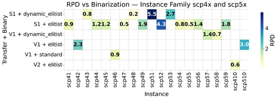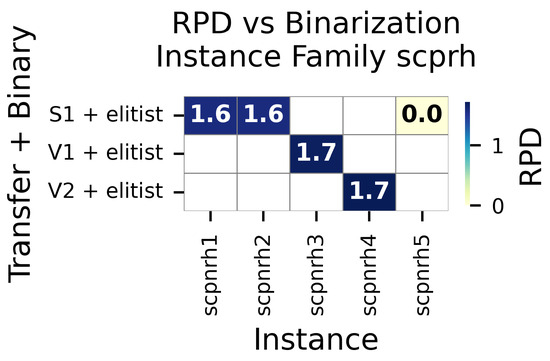 This section presents a comprehensive summary of our BAOA’s performance in all benchmark instances. The statistical analysis is shown in Table 8 and Table 9 (Min, Max, Avg, CV, RPD), while Figure 2, Figure 3, Figure 4 and Figure 5 show the most effective combinations of instance-based binarization.