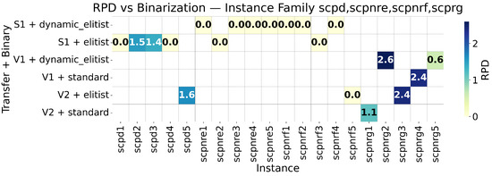Here, we adopt S-shaped and V-shaped transfer functions together with the binarization rules STD, COM, PS, ELIT and ELITR. This is because they capture two key behaviors: cases where mapping continuous values to binary decisions cases where changing the sign should flip the decision (S-shaped, with ), and cases where the magnitude matters regardless of the sign (V-shaped, as a function of ). Here, d denotes the continuous value prior to binarization in the current iteration t; applying yields a probability in of the binarization rules mapping to a binary decision (0/1). These families are monotone, smooth, bounded, and computationally efficient, allowing the exploration–exploitation balance to be adjusted gradually over iterations. For the SCP, the results of the OR-Library instances support these choices; comparative analyses show that the choice of binarization is crucial to performance [13], while systematic studies report that the binarization rule explains more performance variability than the transfer function family.