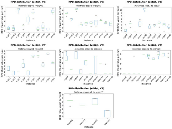 Boxplots RPD distribution for the elitist rule with the V3 transfer function (scpnrh2–scpnrh5). The blue box shows the interquartile range, the black line the median, the green whiskers the 1.5×IQR limits, and the white circles the outliers.
