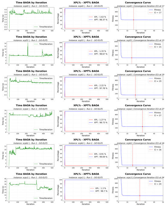 In terms of computational efficiency, the results show that our BAOA achieves high-quality solutions with reduced execution times. Table 6 reports total times in the range of 3 s to 19 s per iteration, depending on the instance (e.g., ∼3.3 s on scp51 and ∼18–19 s on scpd1). Furthermore, the dynamic analysis of Figure 8 and Figure 9 reveals stable behavior; after an initial overload phase, the time per iteration remains virtually constant throughout the execution.