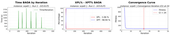 BAOA on (V3–ELIT): Time per iteration, XPL–XPT balance (averages), and convergence curve indicating the point from which the fitness no longer improves.