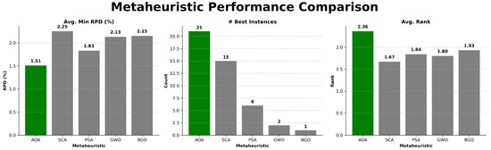 The results show that the BAOA exhibits the most competitive overall performance among the evaluated metaheuristics. In terms of solution quality, the BAOA achieves the lowest average minimum RPD (1.51), indicating solutions consistently closer to the optimal values. Regarding consistency, the BAOA also obtains the highest number of best instances (21), outperforming SCA (15), PSA (6), GWO (2), and BGO (1). Although its average rank (2.36) is not the lowest, the BAOA maintains a strong relative position across all instances. These findings highlight the BAOA’s ability to combine high-quality solutions with robustness and reliability, positioning it as a competitive alternative to other state-of-the-art approaches.