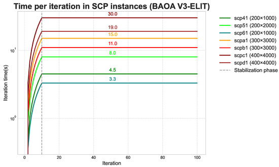 We chose V3-ELIT to develop this section due to its ability to balance exploration and exploitation. The V3 (hyperbolic V-shaped) transfer function introduces smooth and controlled transitions in the binarization, while the ELIT rule preserves the best solutions, which in our experiments translated into low RPDs and practically zero variability (mean = best value; deviation around 0) in most instances. On this basis, Figure 10 shows the time per iteration of BAOA V3-ELIT across several SCP instances, revealing two clear phases: a rapid initial overhead, and a subsequent stabilization phase in which times remain nearly constant. The largest instances, such as scpc1 (400 × 4000) and scpd1 (400 × 4000), reach the highest costs, with 30.0 s and 19.0 s per iteration, respectively, while scpa1 (300 × 3000) and scpb1 (300 × 3000) fall in an intermediate range, with 15.0 s and 11.0 s. In contrast, smaller instances such as scp61 (200 × 1000) and scp51 (200 × 2000) require only 4.5 s and 3.3 s per iteration. This pattern confirms that the computational cost increases with problem size; however, once past the initial phase, the time remains stable, reflecting temporal consistency of the algorithm across instances of different scales.