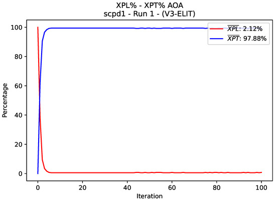 Exploration (XPL%) and exploitation (XPT%) dynamics for BAOA V3-ELIT in the scpd1 instance. The curves show a sharp decline in exploration during the first iterations, stabilizing below 2.12%, while exploitation dominates above 97.88%.