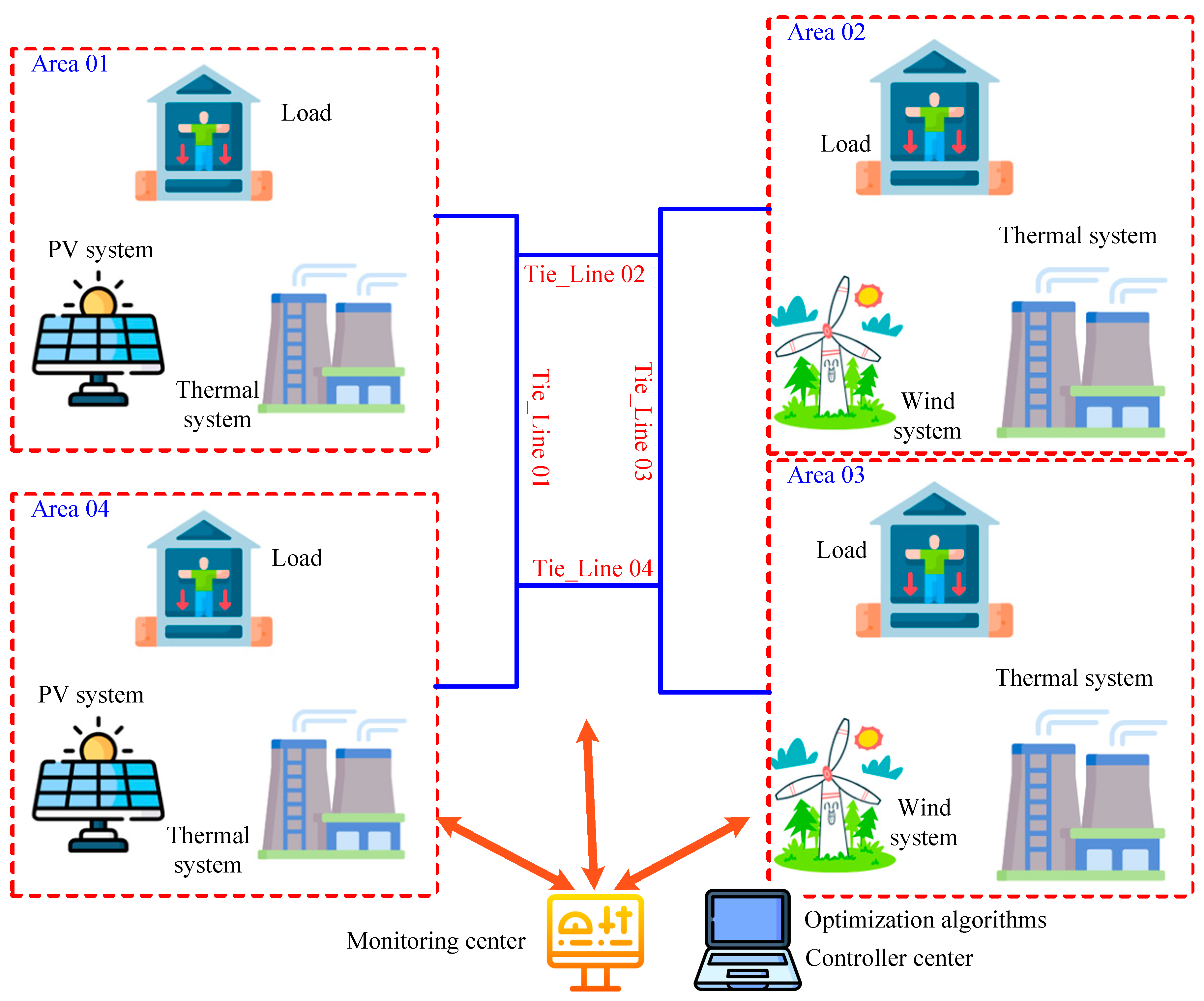 The intricate structure of IPSs has posed significant challenges, and so far, no comprehensive study has explored the combined control of LFC and AVR in four areas: integrated multi-source IPS with GDB, GRC, and BD nonlinearities. To bridge this research gap, the present study investigates a four-area IPS setup, where each area includes five generation components, among which are three conventional types and two RES (solar energy and wind turbine). The proposed novel AOA, a recently established metaheuristic technique, is utilized to determine the optimum gains for several controllers, including PI, PI-PD, I-PD, I-P, PI(1+DD), and PID. The goal is to enhance dynamic responsiveness and the overall system’s performance while dealing with the difficulties of multi-source power production and nonlinear impacts. Figure 1 depicts the proposed LFC and AVR structures for integrated power systems incorporating RES.