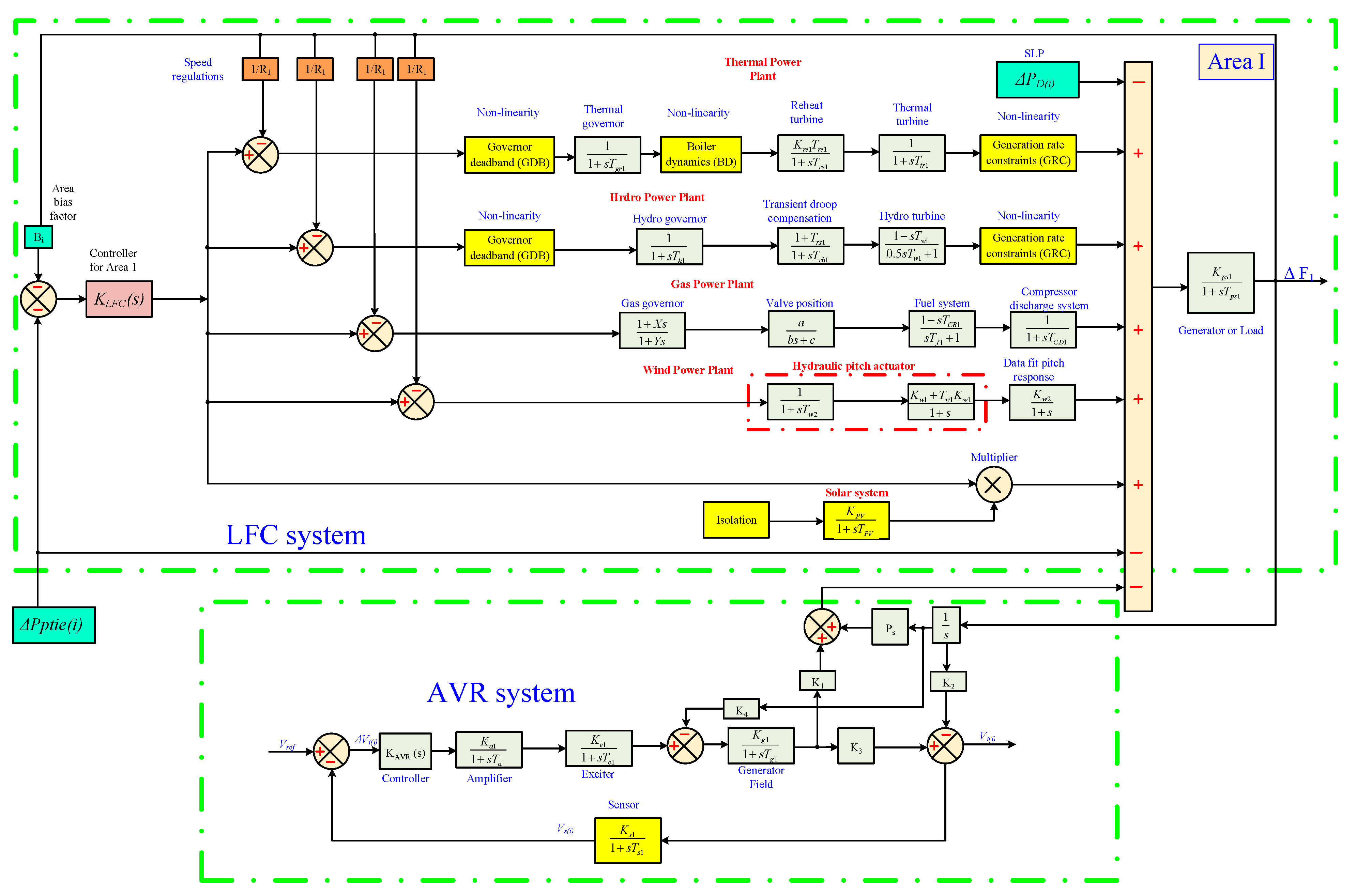 The literature on LFC and AVR is vast, but many studies primarily enumerate controller types and optimization techniques without critically discussing their limitations. For example, classical controllers such as PI and PID are still widely used, but they often fail to achieve optimal performance under complex, nonlinear conditions. On the other hand, recent advancements in optimization techniques, including Spider Wasp Optimizer-optimized Cascaded Fractional-order Controllers [7] and Fractional-order PID Controllers using Aquila Optimization [8] have shown promise but still face challenges in accurately modeling and regulating multi-source systems with significant renewable energy integration. Moreover, Model Predictive Control (MPC) methods have also been explored, particularly for systems that consider wind power forecasting, but they are often computationally expensive and can struggle with real-time applications [9]. A critical review of these approaches highlights the need for more adaptive and efficient control structures that can handle the increasing complexity of modern power systems. By discussing these recent developments in detail, we can clearly position our proposed approach within the existing body of work, demonstrating its unique advantages.