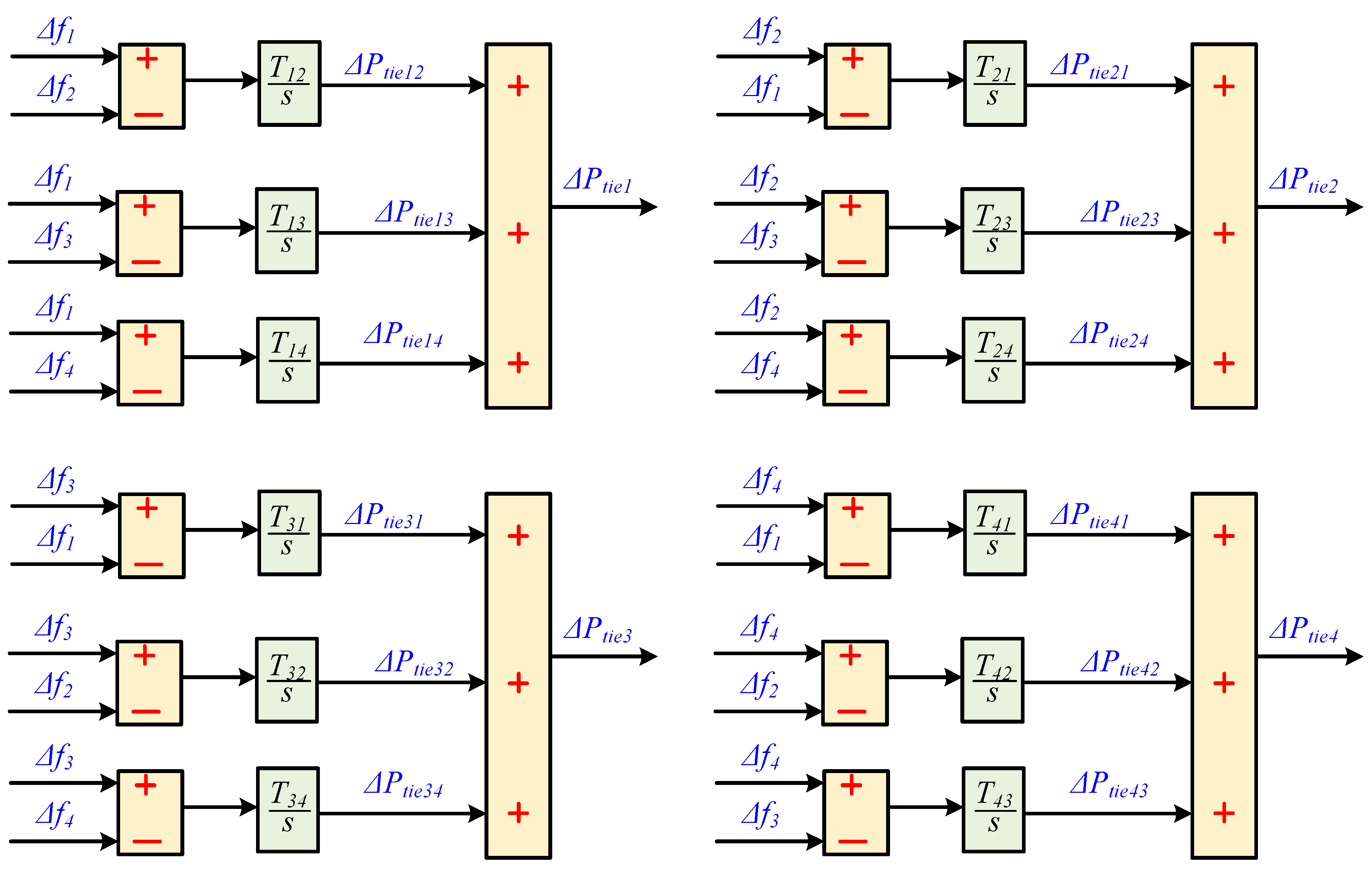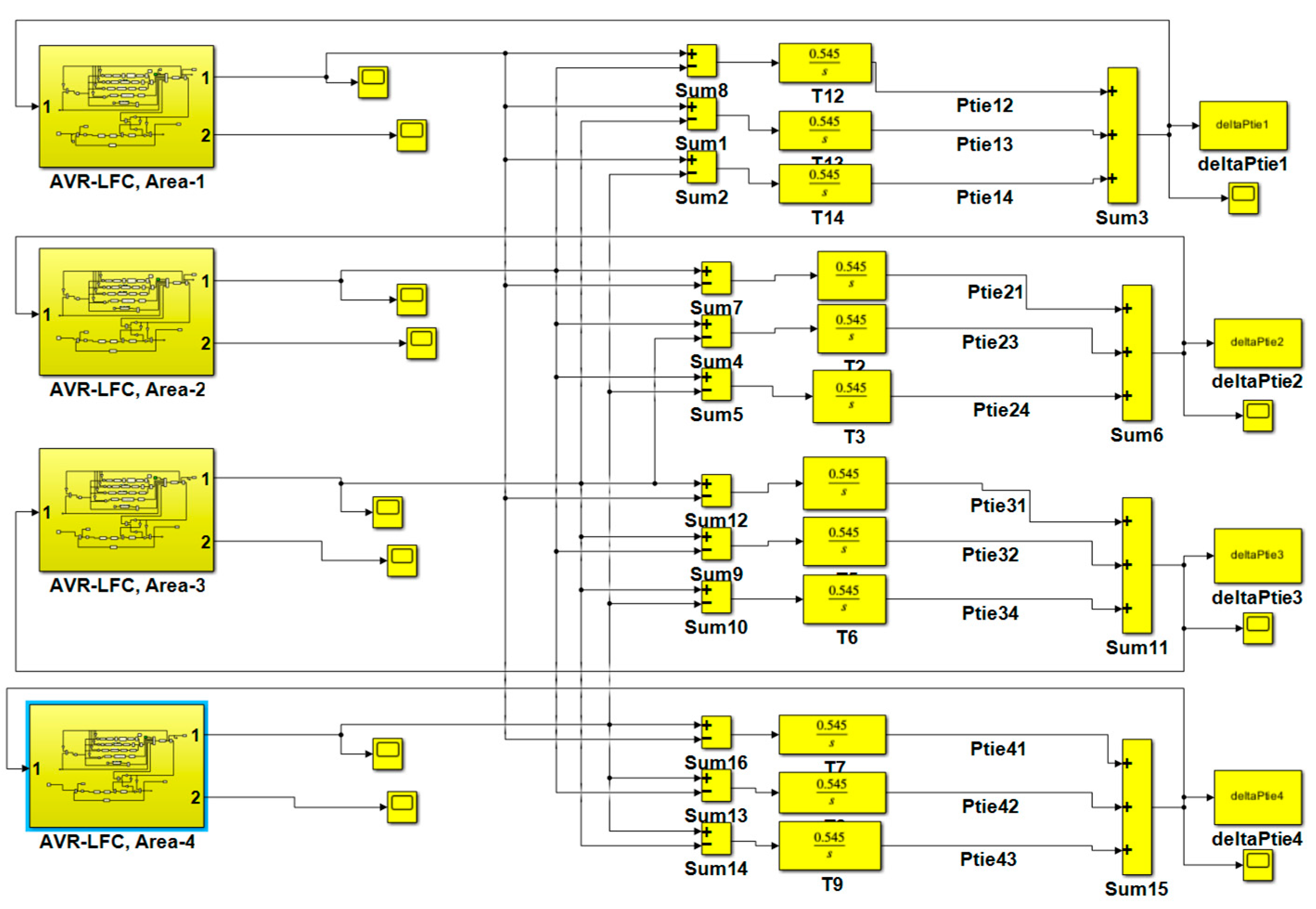 Figure 3 depicts the four-area multi-source IPS designs with both AVR and LFC loops. The two control loops are interconnected by various connection variables. The IPS includes four distinct areas, each powered by five types of energy sources: gas, hydro, thermal reheat, solar, and wind generation components. As shown in Figure 4, every LFC area is connected to the others via tie-lines. The LFC loop is accountable for preserving the desired power frequency within the IPS. The system’s time constants, gains, and other parameters are adopted from [17] and shown in Table 2. Lastly, Figure 5 shows the whole four-area linked power system with the appropriate tie-line connections. Control in the ith area’s LFC loop consists of thermal reheat speed regulation (Rt), hydro speed regulation (Rh), gas speed regulation (Rg), wind speed regulation (Rw), the area’s bias factor (Bi), the LFC controller KLFC(s), and generator/load dynamics K p ( i ) / ( 1 + s T p ( i ) ) . The thermal reheat unit is composed of three main components: a thermal governor represented by 1 / ( 1 + s T g r ) , a reheat turbine modeled as K r e T r e / ( 1 + s T r e ) , and a thermal turbine described by 1 / ( 1 + s T t r ) . The hydro unit comprises three components: transient droop compensation, represented by ( 1 + s T r s ) / ( 1 + s T r h ) ; a hydro governor modeled as 1 / ( 1 + s T h ) ; a hydro turbine characterized by ( 1 s T w ) / ( 1 + 0.5 s T w ) . The gas unit consists of four components: a gas governor represented by ( 1 + s X ) / ( 1 + s Y ) , a valve position control modeled as a / ( s b + c ) , a fuel system described by ( 1 s T C R ) / ( 1 + s T f ) , and a compressor discharge system given by 1 / ( 1 + s T C D ) . The wind generation unit includes two main components: a data-fitted pitch response block and a hydraulic pitch actuator block. The solar photovoltaic system is modeled using a simple step function. ΔPD(i), ΔPtie(i), ΔVt(i), and Δf(i), represent the deviations in load, tie-line power, AVR, and LFC, respectively. Vs(i), Vref(i), Ve(i), and Vt(i), indicate the sensor voltage, reference voltage, error voltage, and terminal voltage in the ith area, respectively. The AVR loop of the ith area consists of five components: an amplifier represented by K a ( i ) / ( 1 + s T a ( i ) ) , a generator modeled as T g ( i ) / ( 1 + s T g ( i ) ) , an exciter given by K e ( i ) / ( 1 + s T e ( i ) ) , a sensor described by K s ( i ) / ( 1 + s T s ( i ) ) , and a controller denoted as KAVR(s). Various coupling coefficients, such as K1, K2, K3, K4, and Ps, are utilized to couple the AVR and LFC loops. The synchronization coefficient between the ith and jth areas is denoted by Tij. Equations (1)–(5) give the transfer functions for the gas GG(s), reheat thermal GT(s), hydro GH(s), wind GW(s), and solar photovoltaic GS(s) systems, respectively.
