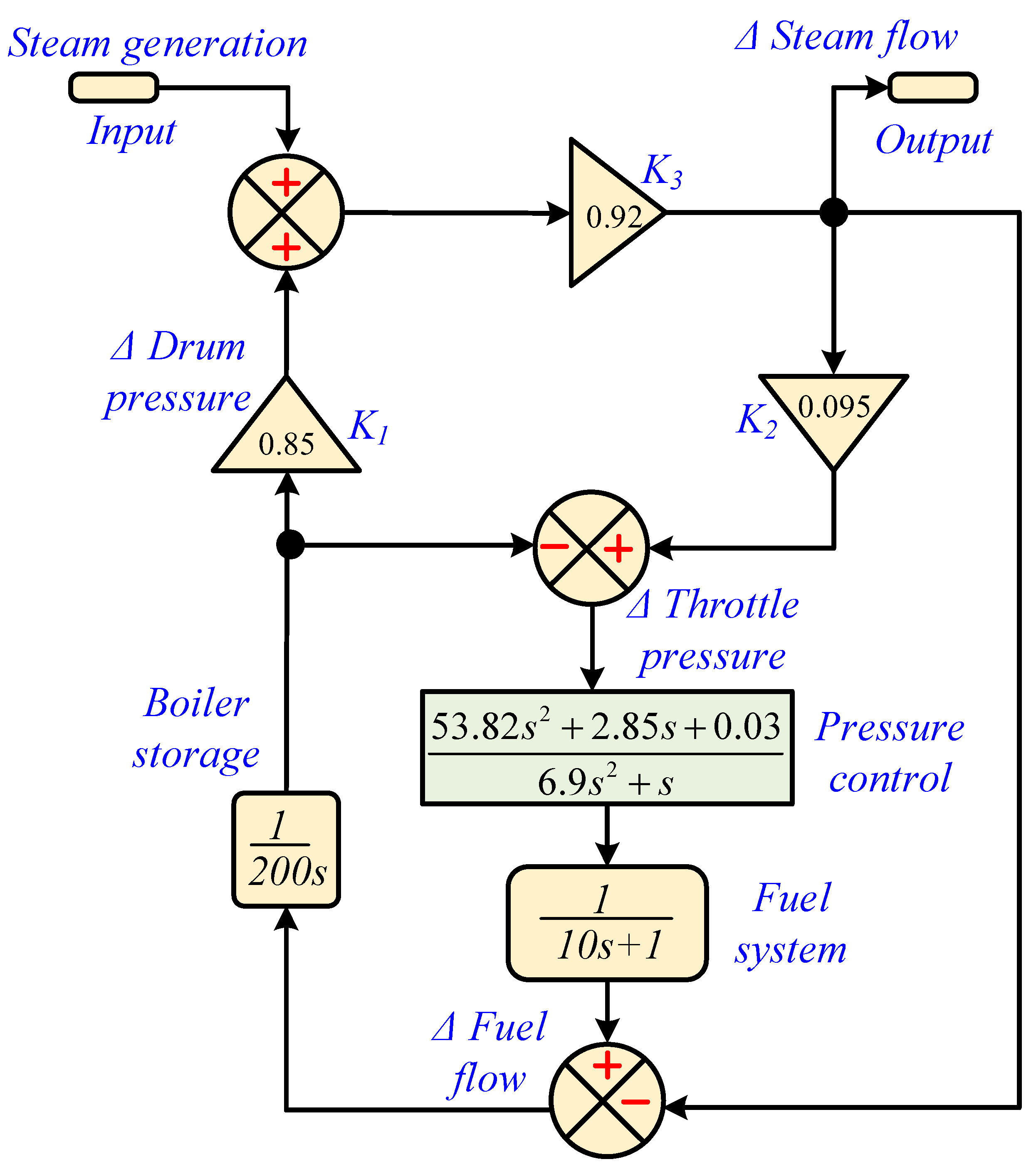 The combustion control system is integrated into the boiler dynamics transfer function model, as illustrated in Figure 6. This model is adaptable and may be used for a variety of plant types, including gas or oil-fired plants with less accurate ignition control and coal-fired power stations with strictly controlled ignition. In most steam power plants, generation adjustments are made through turbine control valves. When the system detects changes in steam pressure or flow, the boiler control system promptly responds to maintain stability. The corresponding transfer function for boiler dynamics is depicted in Figure 6.