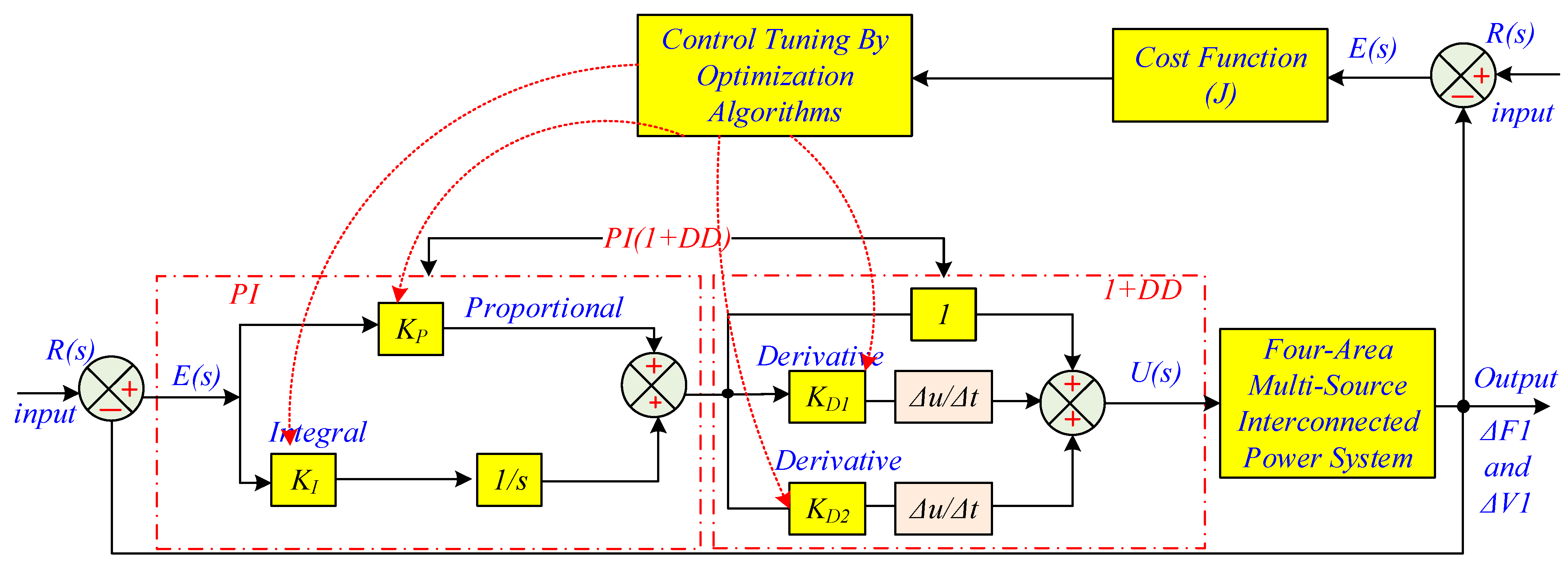 • Mathematical modeling of the proposed PI(1+DD) controller tailored for the four-area IPS architecture; formulation of fitness functions using AOA to control the optimum fine-tuning parameters of PI(1+DD) and other controllers.