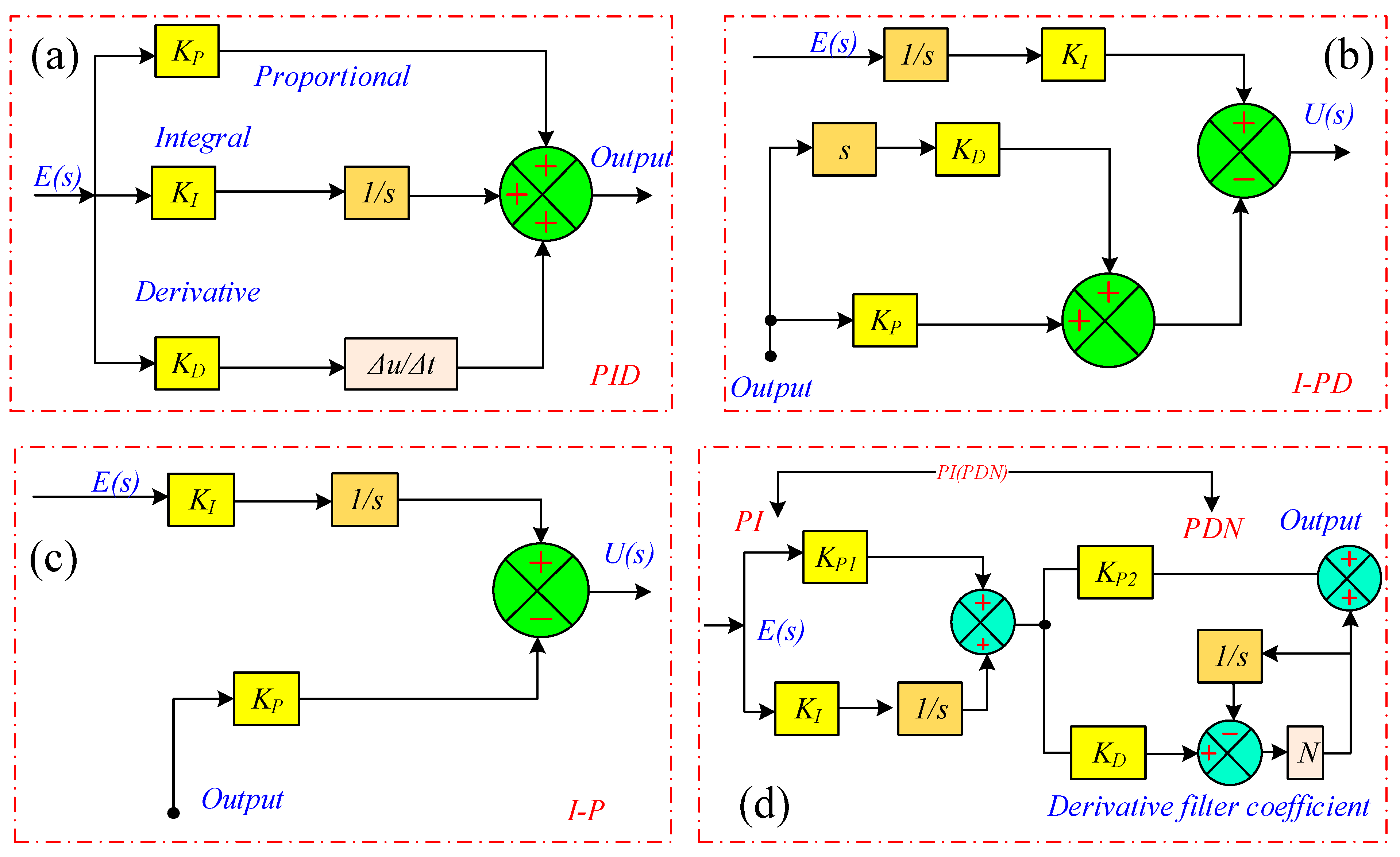 The PI(1+DD) controller combines two levels of control: PI and DD. The controller structure is depicted in Figure 7, where the two components interact to provide improved transient response. The architecture features five adjustable parameters: Kp (proportional gain), Ki (integral gain), Kk1 and K2 (derivative gains), and a constant gain of 1. These parameters provide significant flexibility in adjusting the controller’s dynamic response.