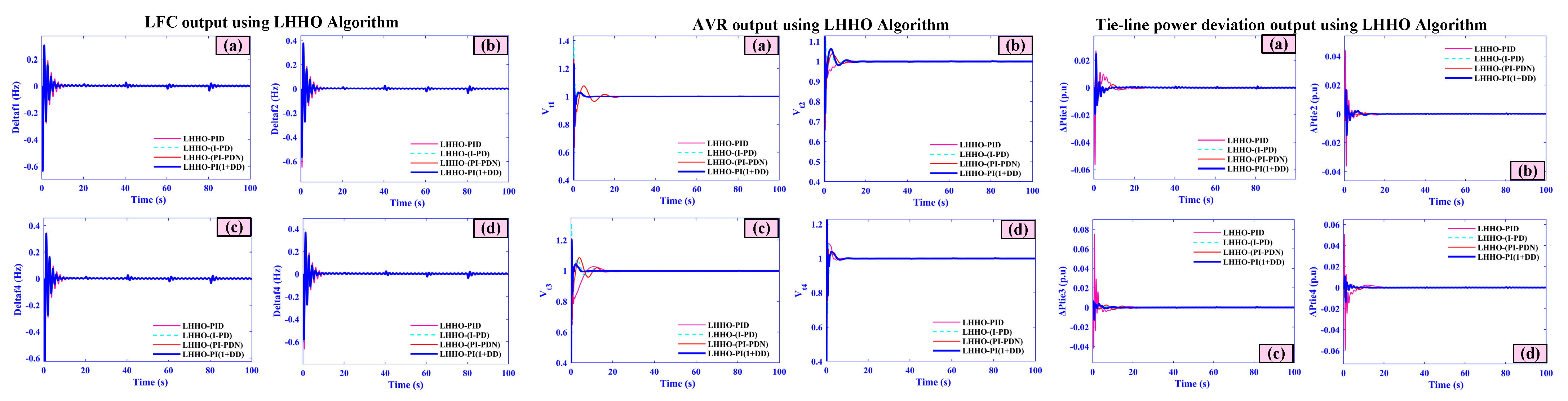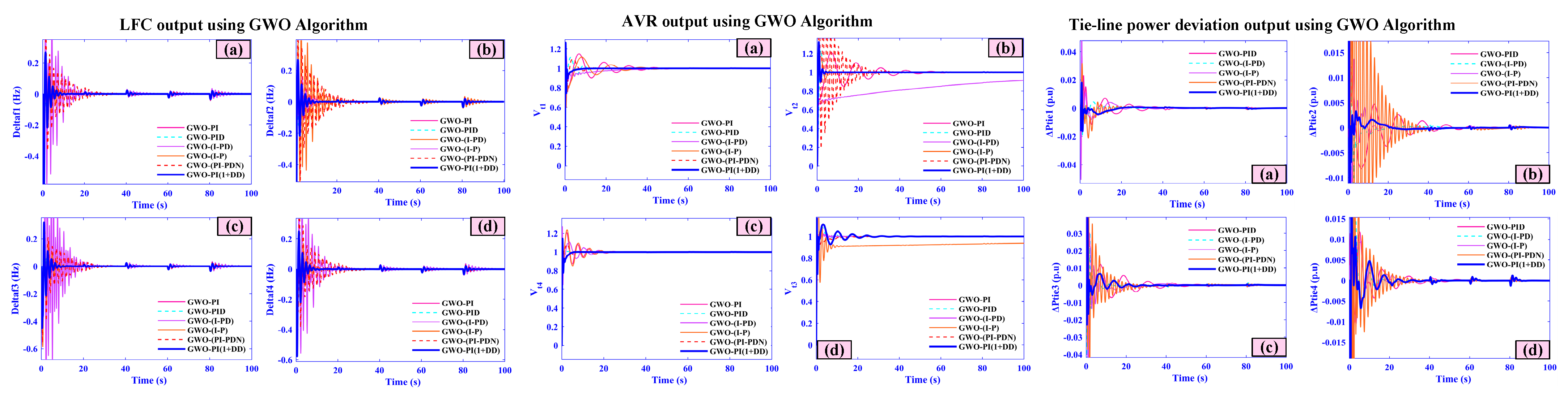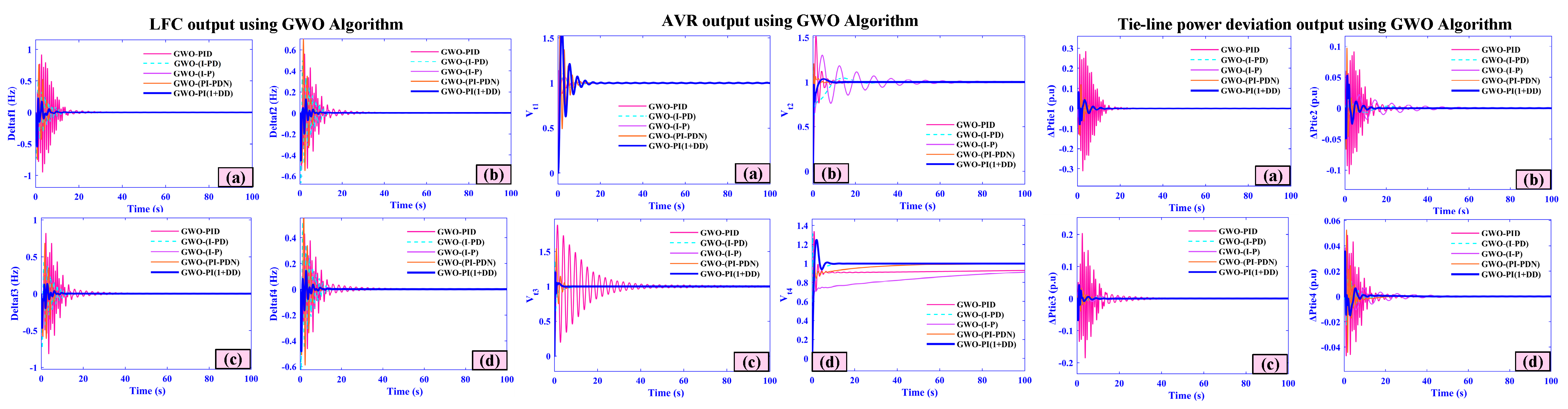 • The performance and robustness of a proposed controller are thoroughly examined under a variety of circumstances, including abrupt load changes at t = 0, accidental load oscillations, power systems that frequently display nonlinearities such as GDB, BD, and GRC, timing-dependent reference voltages in all four positions, and fluctuations in system parameters of between −25% and +25%.