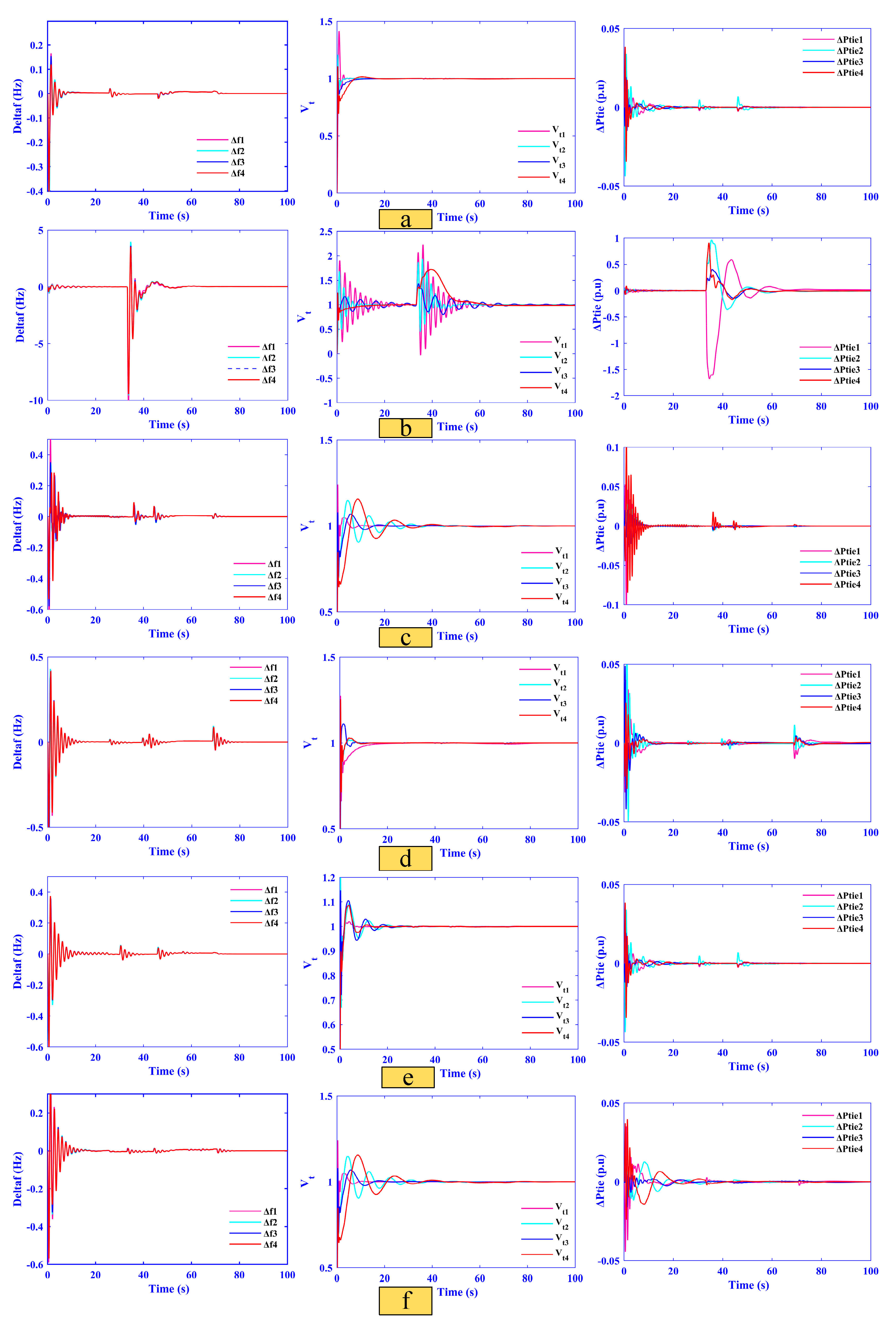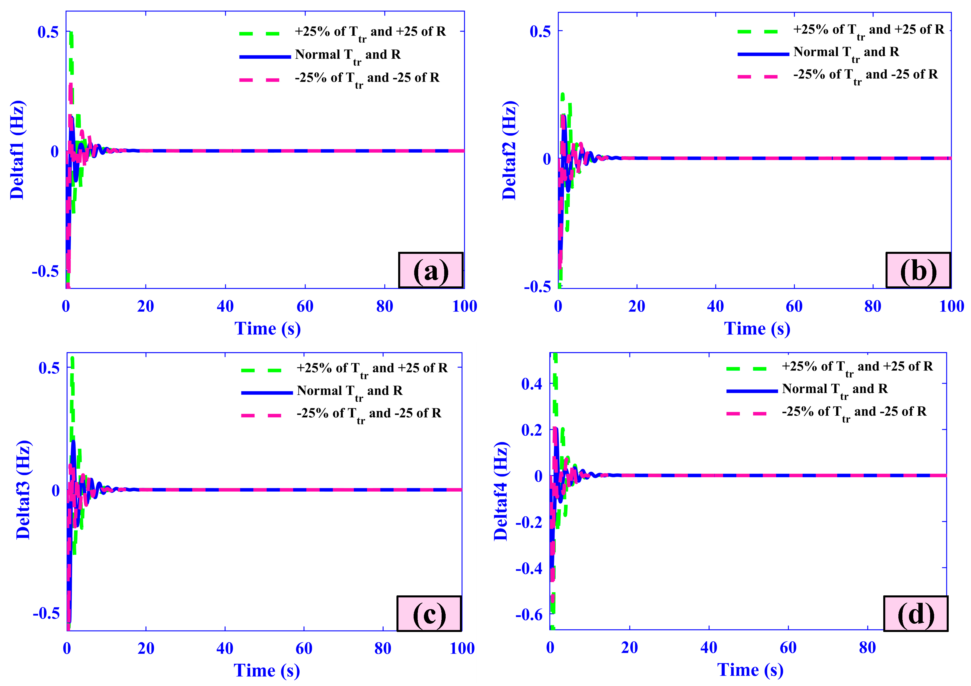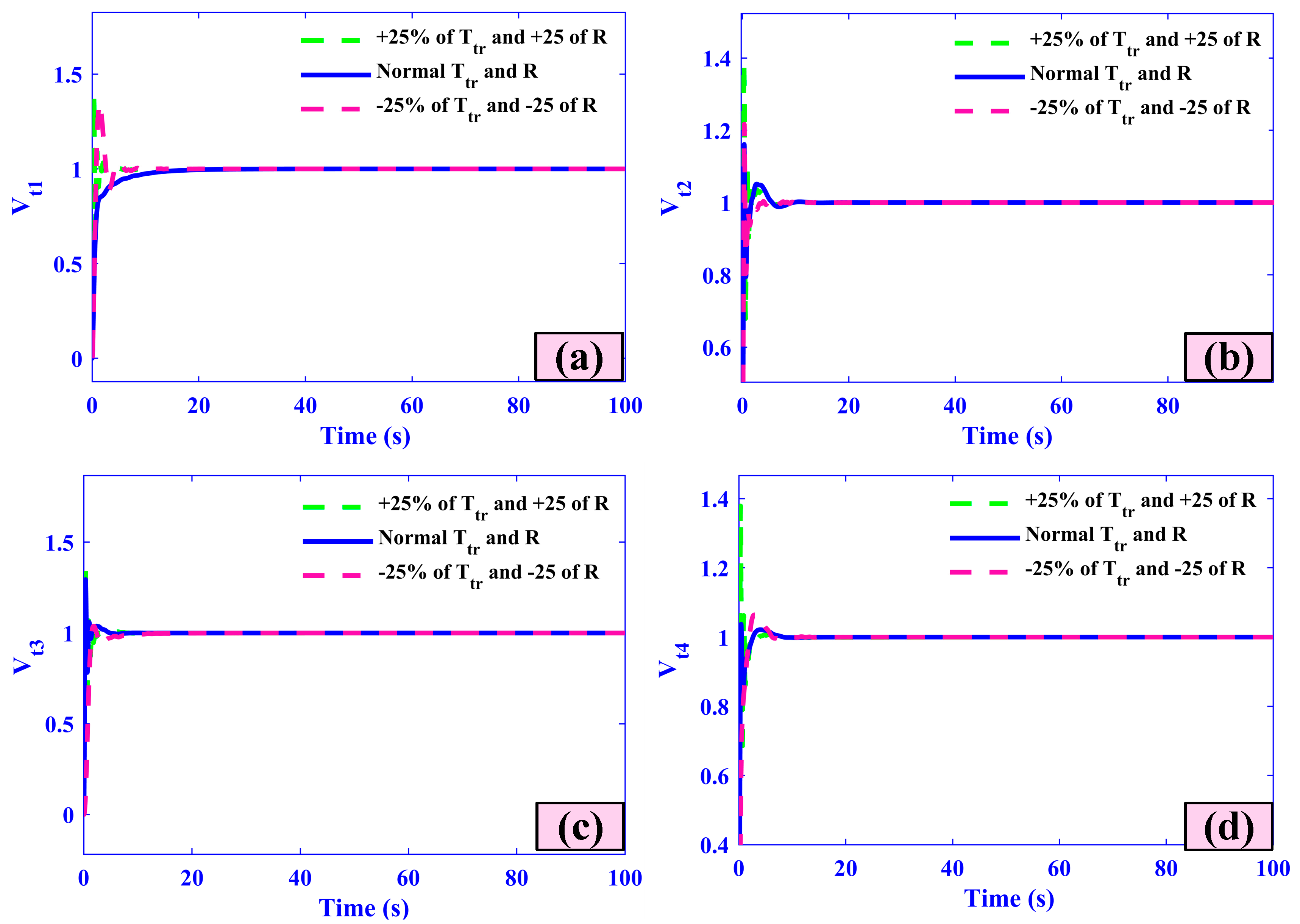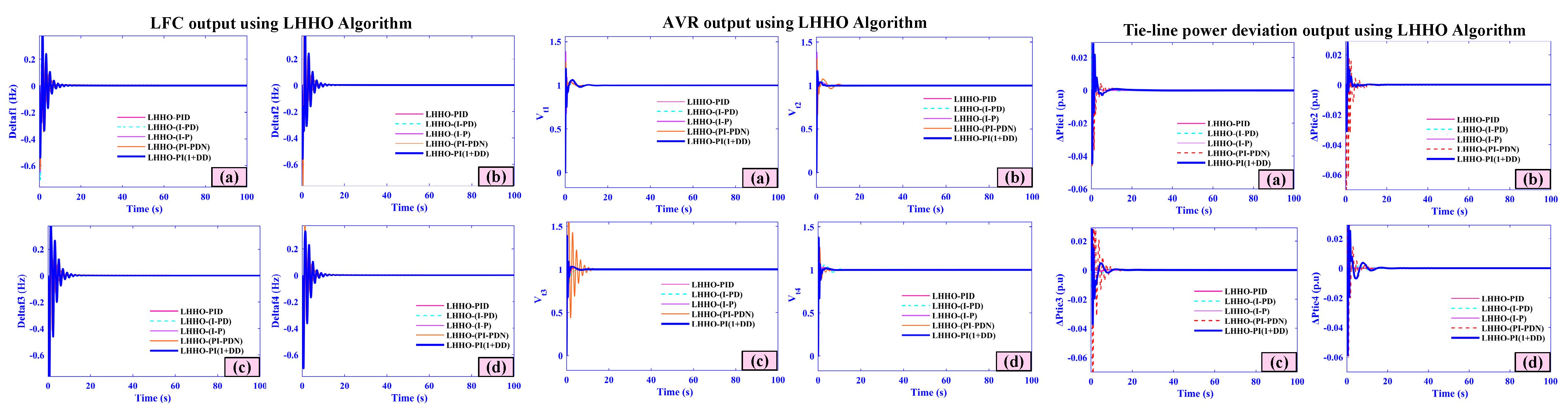 • The performance and robustness of a proposed controller are thoroughly examined under a variety of circumstances, including abrupt load changes at t = 0, accidental load oscillations, power systems that frequently display nonlinearities such as GDB, BD, and GRC, timing-dependent reference voltages in all four positions, and fluctuations in system parameters of between −25% and +25%.