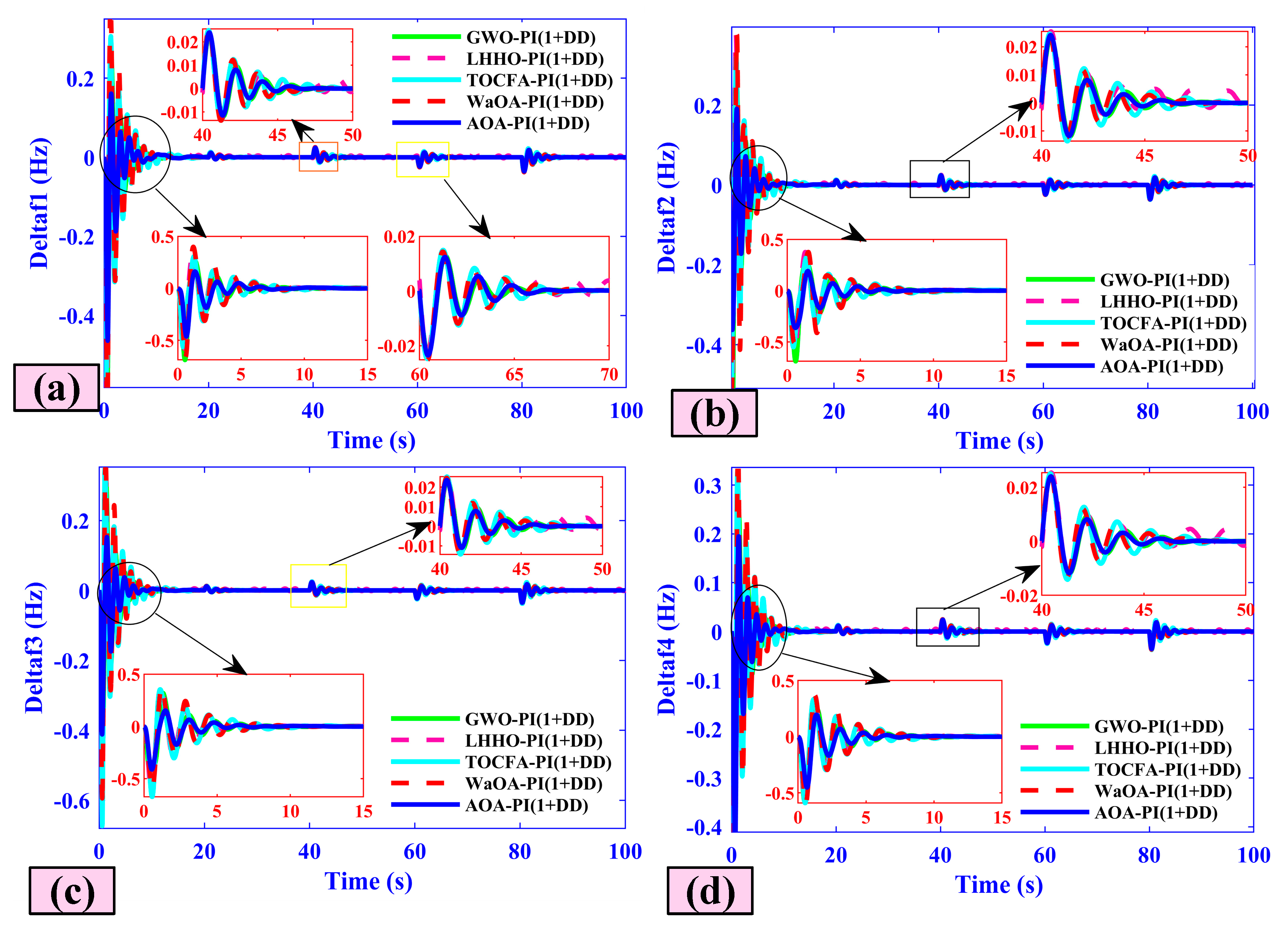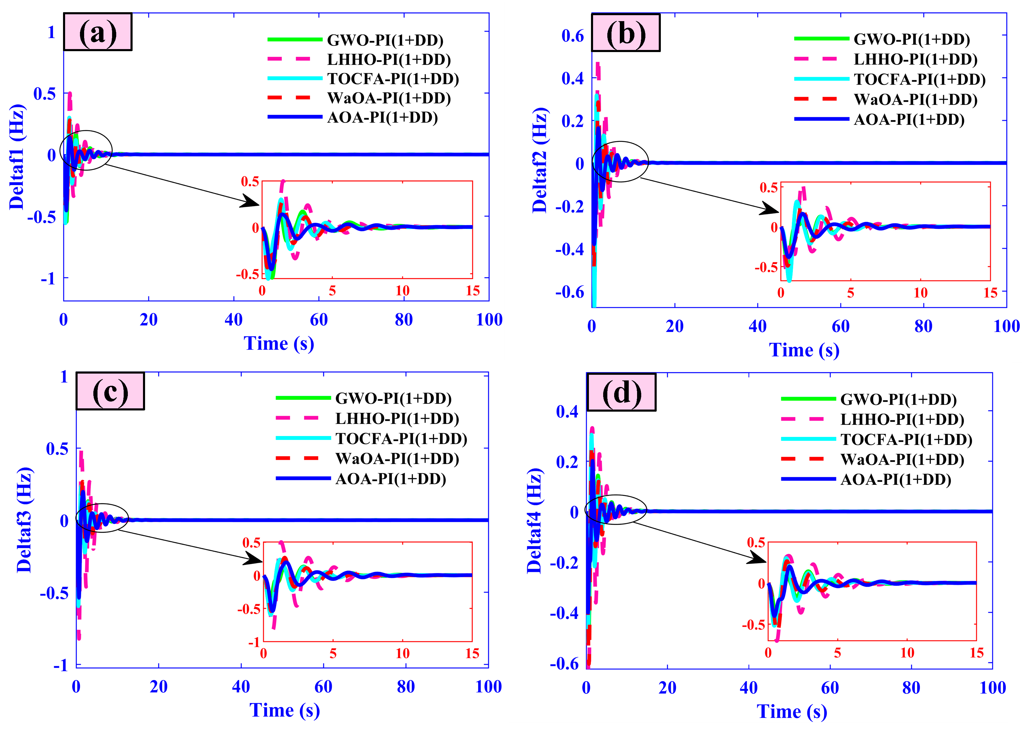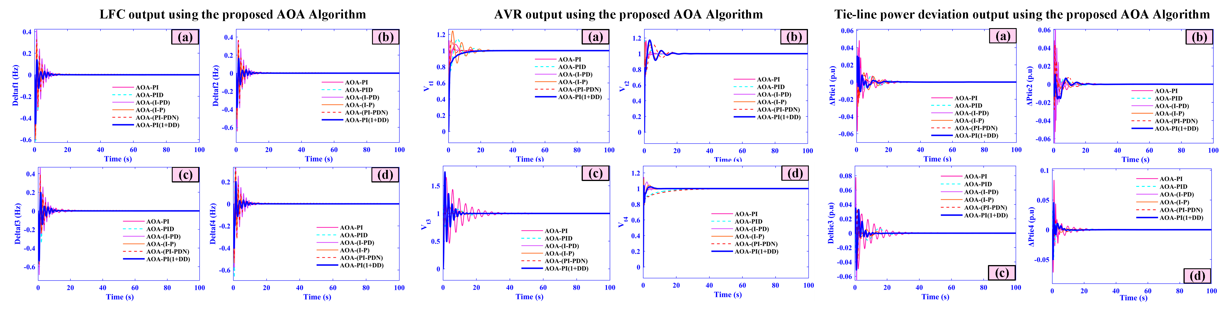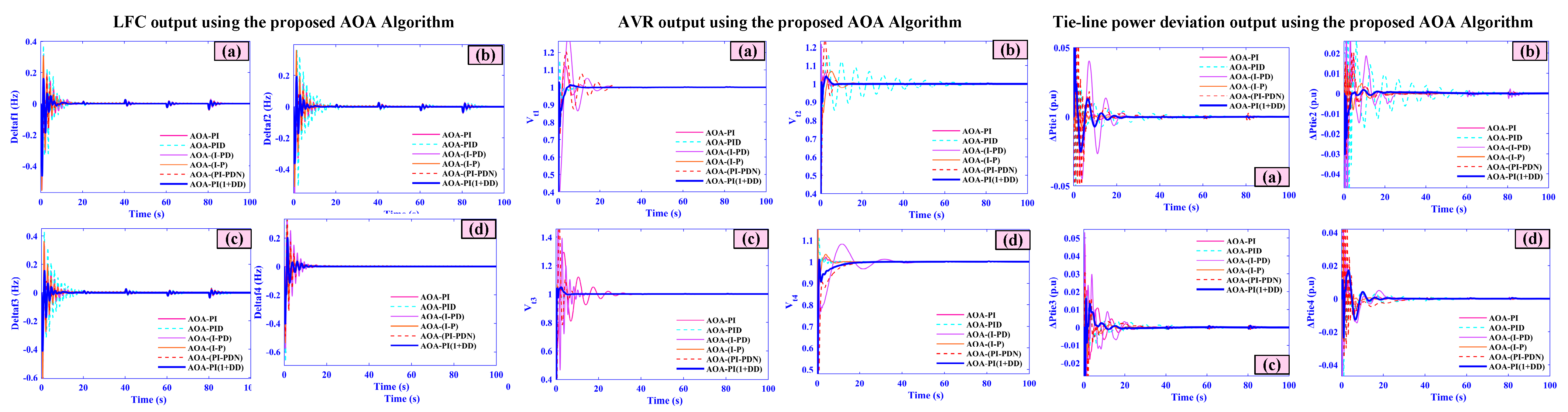 In addition, while many recent variants of the PID controller, such as the BELBIC PID [53,54,55], Sigmoid PID [56,57], and Neuroendocrine PID controllers [58], have been developed to improve performance in complex systems, but they still encounter significant limitations in multi-area interconnected power systems. The BELBIC PID controller, for example, is effective in simple systems but may struggle with the nonlinearities and time-varying nature of modern power grids. Similarly, the Sigmoid PID and Neuroendocrine PID controllers, while effective in specific applications, may not offer the same level of robustness and adaptability required in power systems with high levels of renewable energy integration. The PI(1+DD) controller, optimized using the AOA, is particularly well-suited for these complex systems. Its ability to incorporate a derivative delay term helps mitigate overshoot and enhance transient stability, while the AOA optimization ensures that it can handle the nonlinear dynamics of RES more effectively. This makes the PI(1+DD) controller a more appropriate choice for the challenges of modern multi-area interconnected power systems, addressing the gaps left by other advanced PID variants.