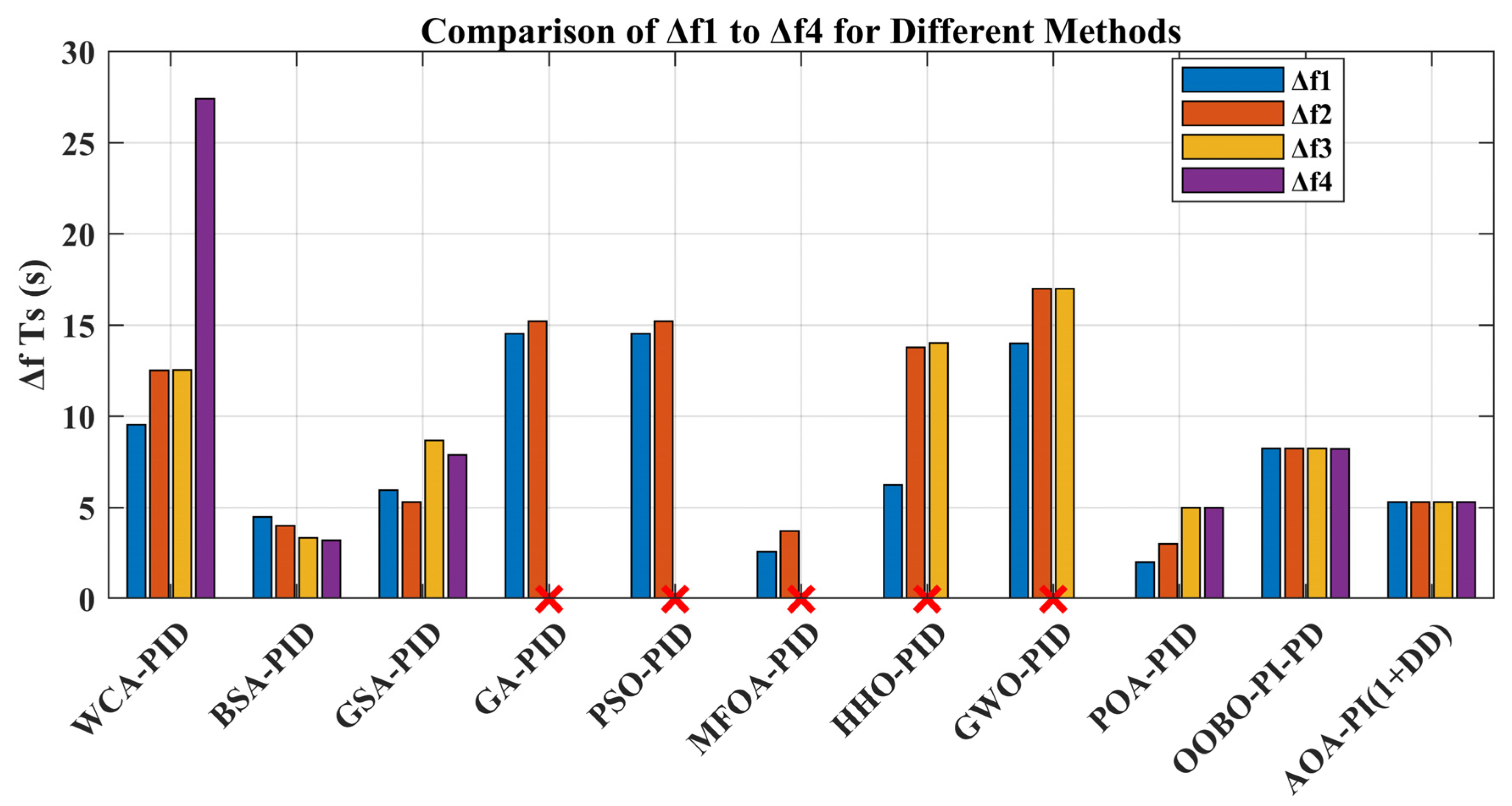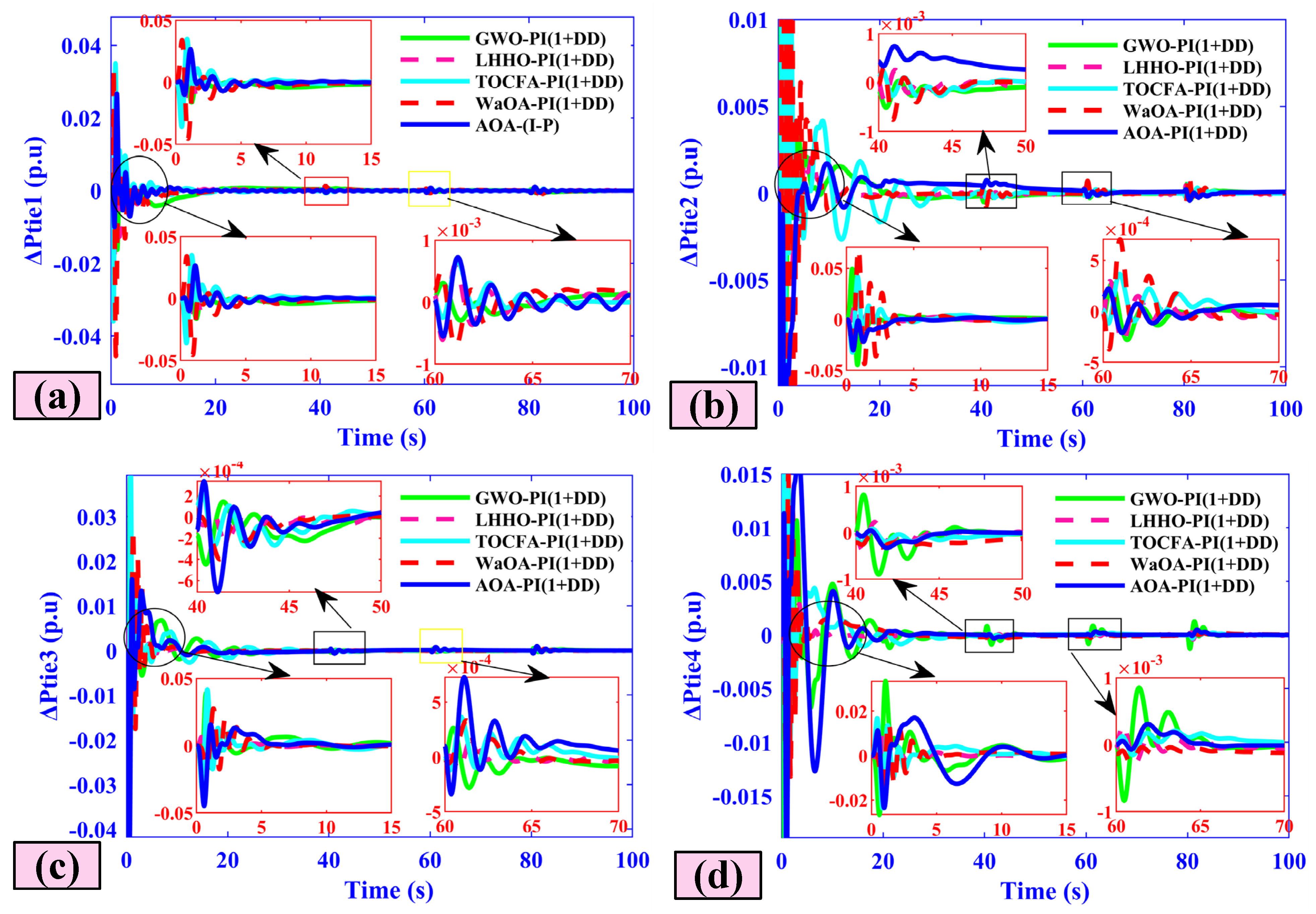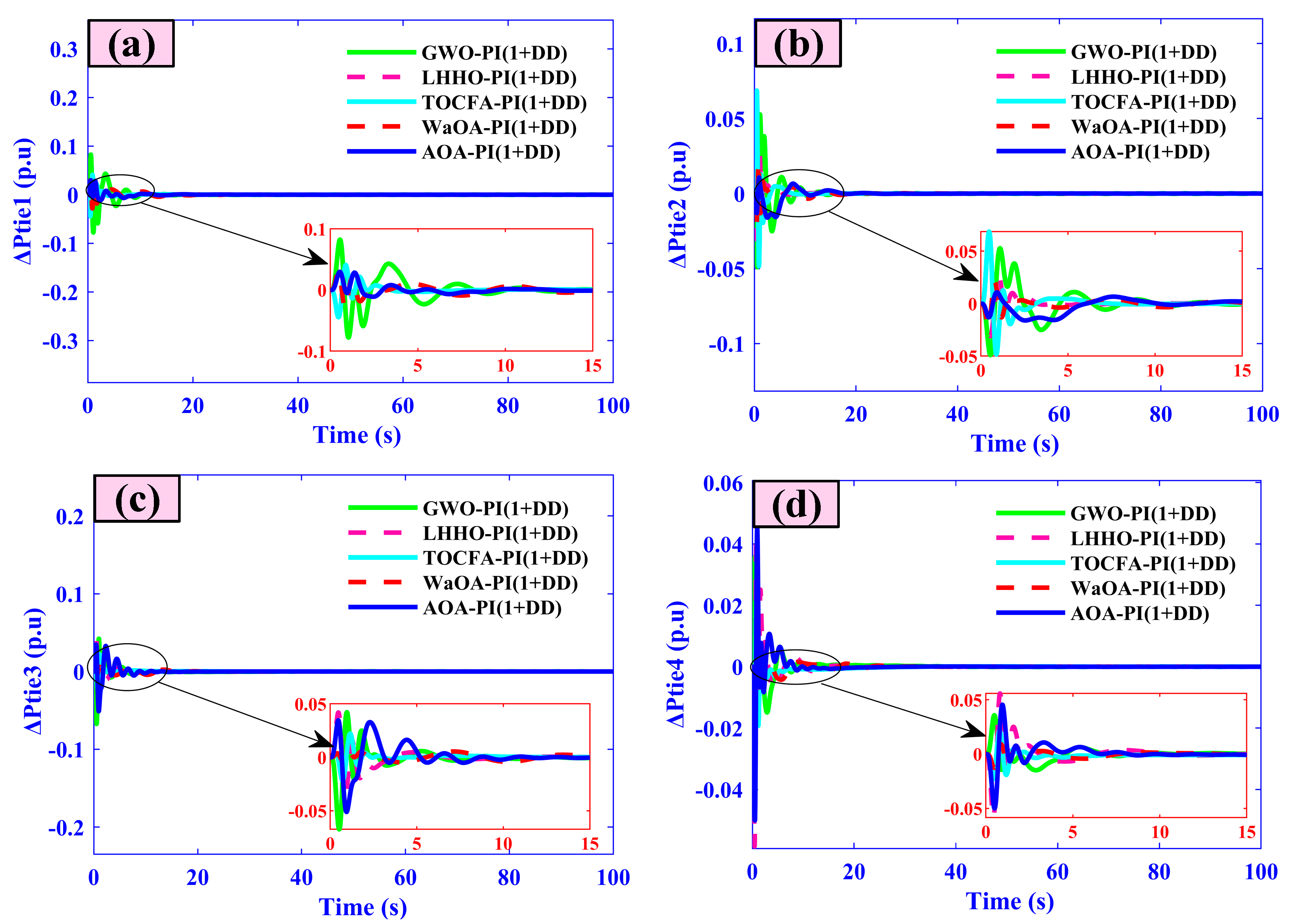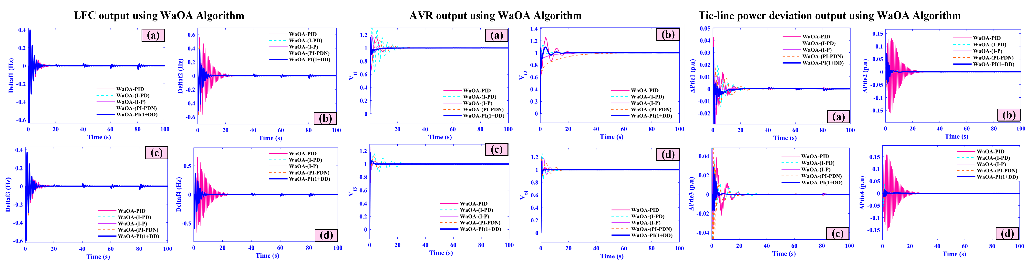 In addition, while many recent variants of the PID controller, such as the BELBIC PID [53,54,55], Sigmoid PID [56,57], and Neuroendocrine PID controllers [58], have been developed to improve performance in complex systems, but they still encounter significant limitations in multi-area interconnected power systems. The BELBIC PID controller, for example, is effective in simple systems but may struggle with the nonlinearities and time-varying nature of modern power grids. Similarly, the Sigmoid PID and Neuroendocrine PID controllers, while effective in specific applications, may not offer the same level of robustness and adaptability required in power systems with high levels of renewable energy integration. The PI(1+DD) controller, optimized using the AOA, is particularly well-suited for these complex systems. Its ability to incorporate a derivative delay term helps mitigate overshoot and enhance transient stability, while the AOA optimization ensures that it can handle the nonlinear dynamics of RES more effectively. This makes the PI(1+DD) controller a more appropriate choice for the challenges of modern multi-area interconnected power systems, addressing the gaps left by other advanced PID variants.