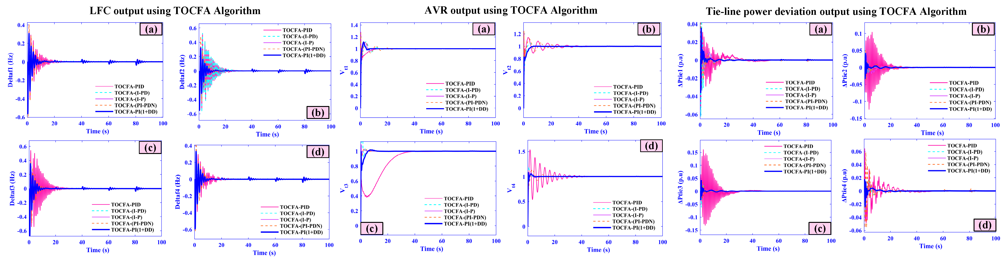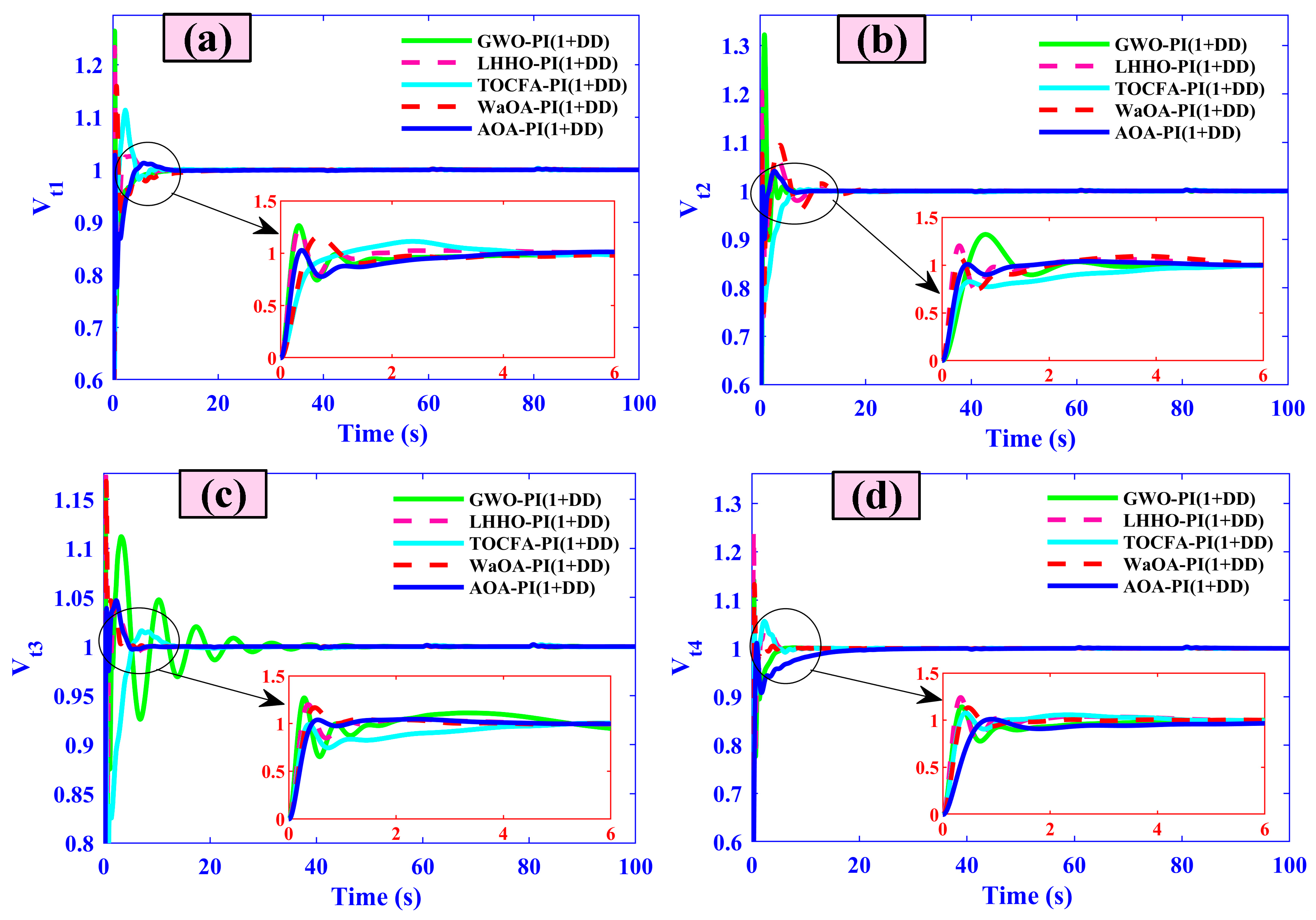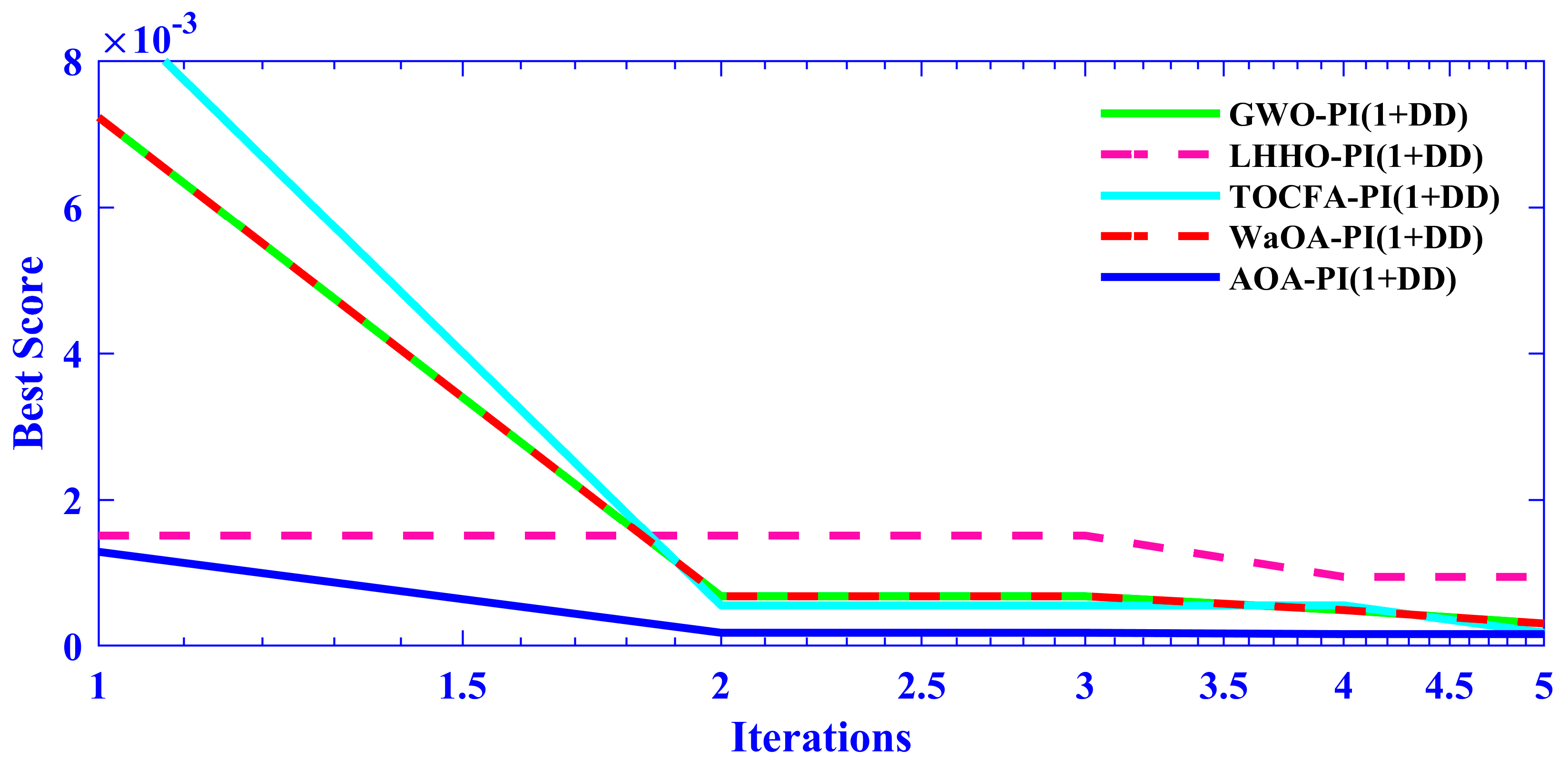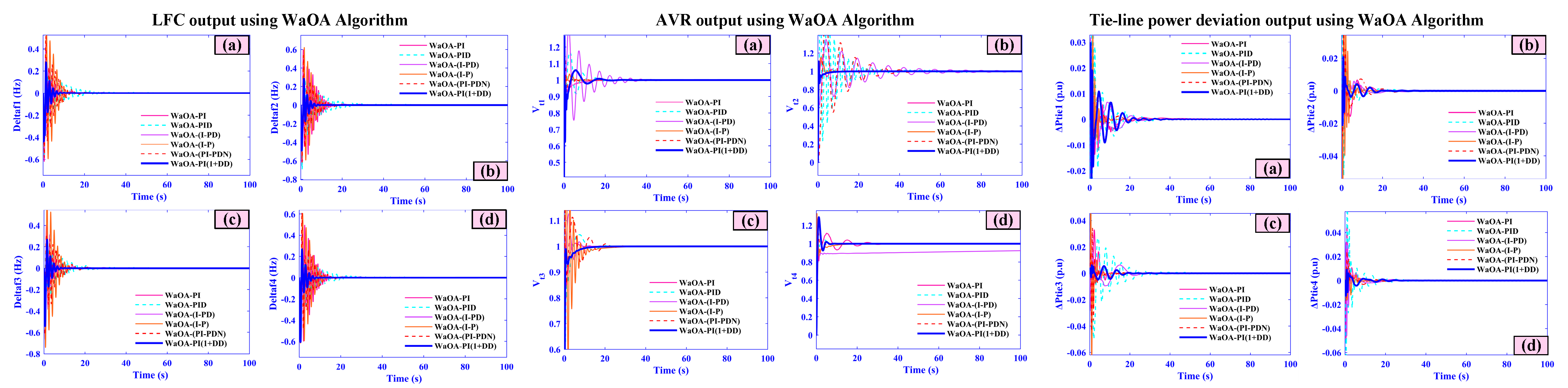 In addition, while many recent variants of the PID controller, such as the BELBIC PID [53,54,55], Sigmoid PID [56,57], and Neuroendocrine PID controllers [58], have been developed to improve performance in complex systems, but they still encounter significant limitations in multi-area interconnected power systems. The BELBIC PID controller, for example, is effective in simple systems but may struggle with the nonlinearities and time-varying nature of modern power grids. Similarly, the Sigmoid PID and Neuroendocrine PID controllers, while effective in specific applications, may not offer the same level of robustness and adaptability required in power systems with high levels of renewable energy integration. The PI(1+DD) controller, optimized using the AOA, is particularly well-suited for these complex systems. Its ability to incorporate a derivative delay term helps mitigate overshoot and enhance transient stability, while the AOA optimization ensures that it can handle the nonlinear dynamics of RES more effectively. This makes the PI(1+DD) controller a more appropriate choice for the challenges of modern multi-area interconnected power systems, addressing the gaps left by other advanced PID variants.