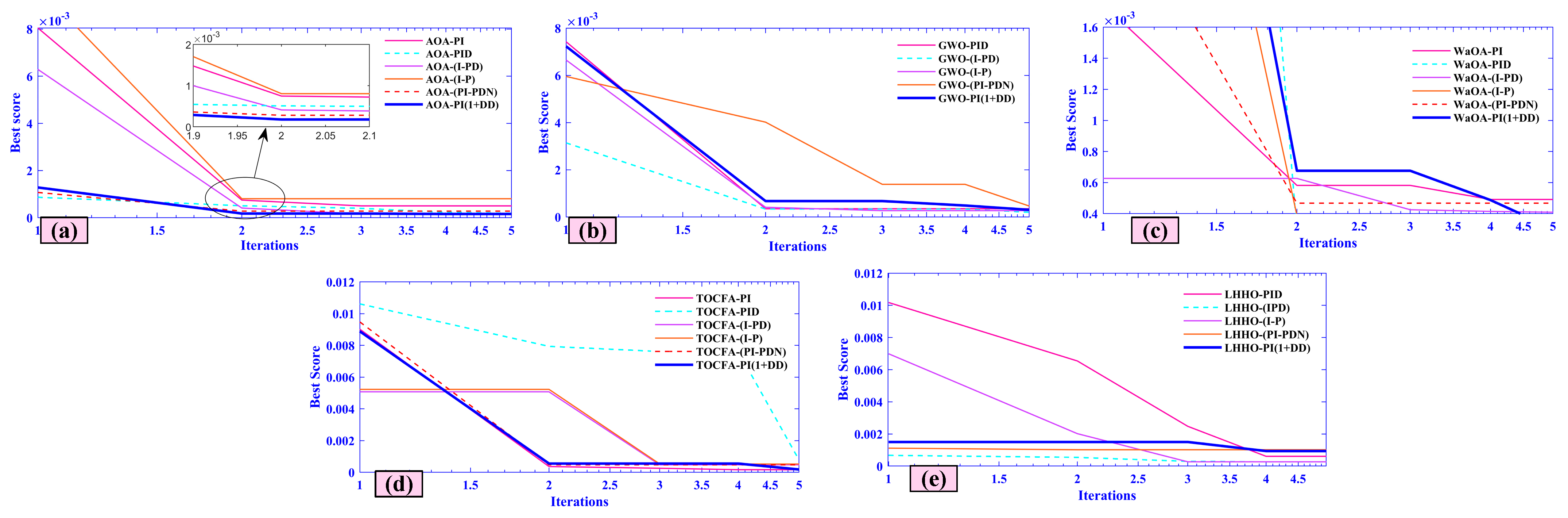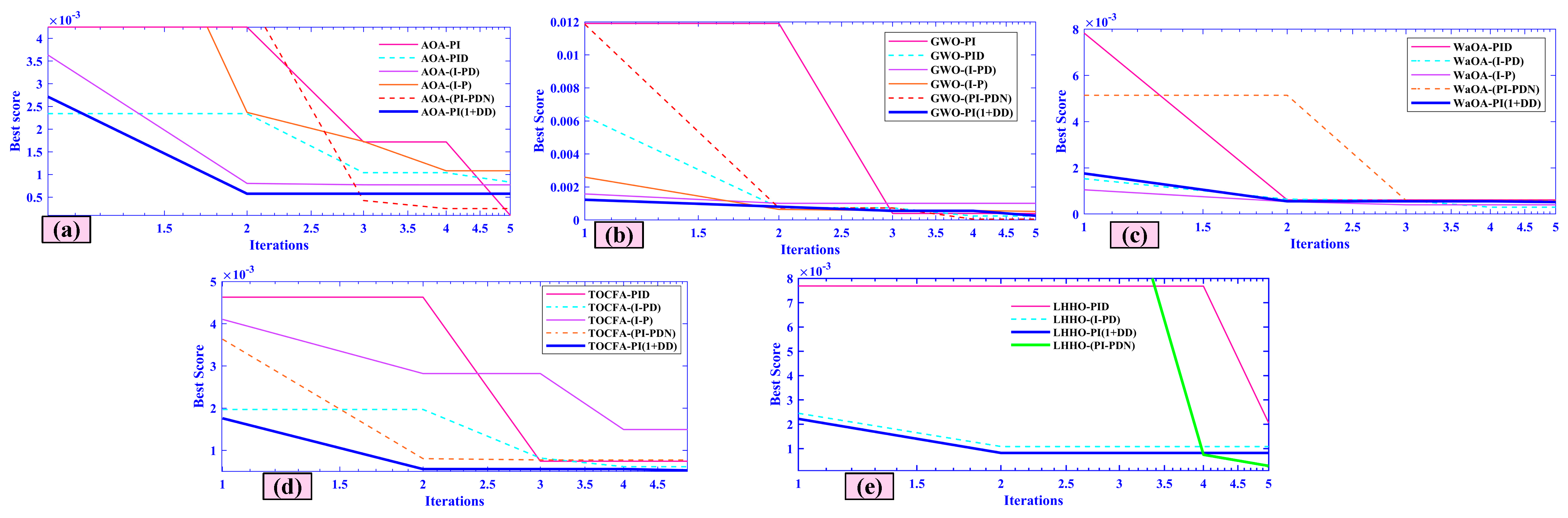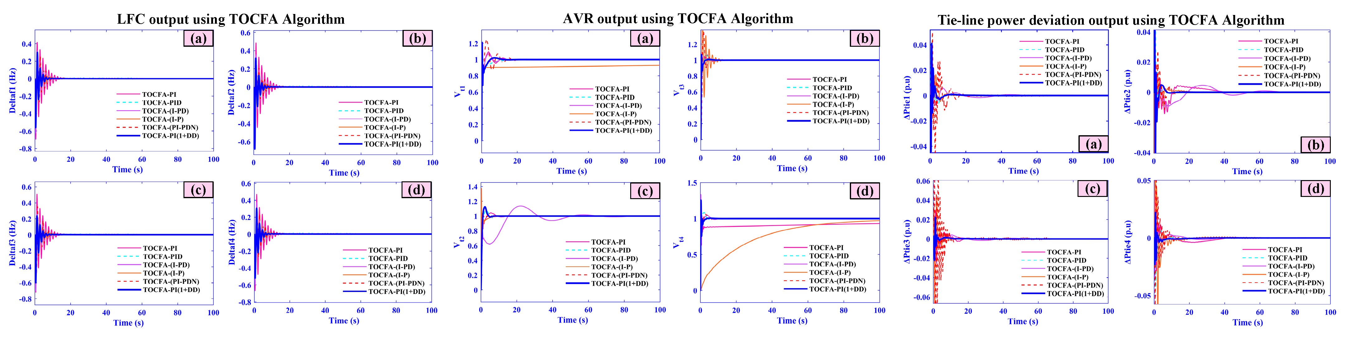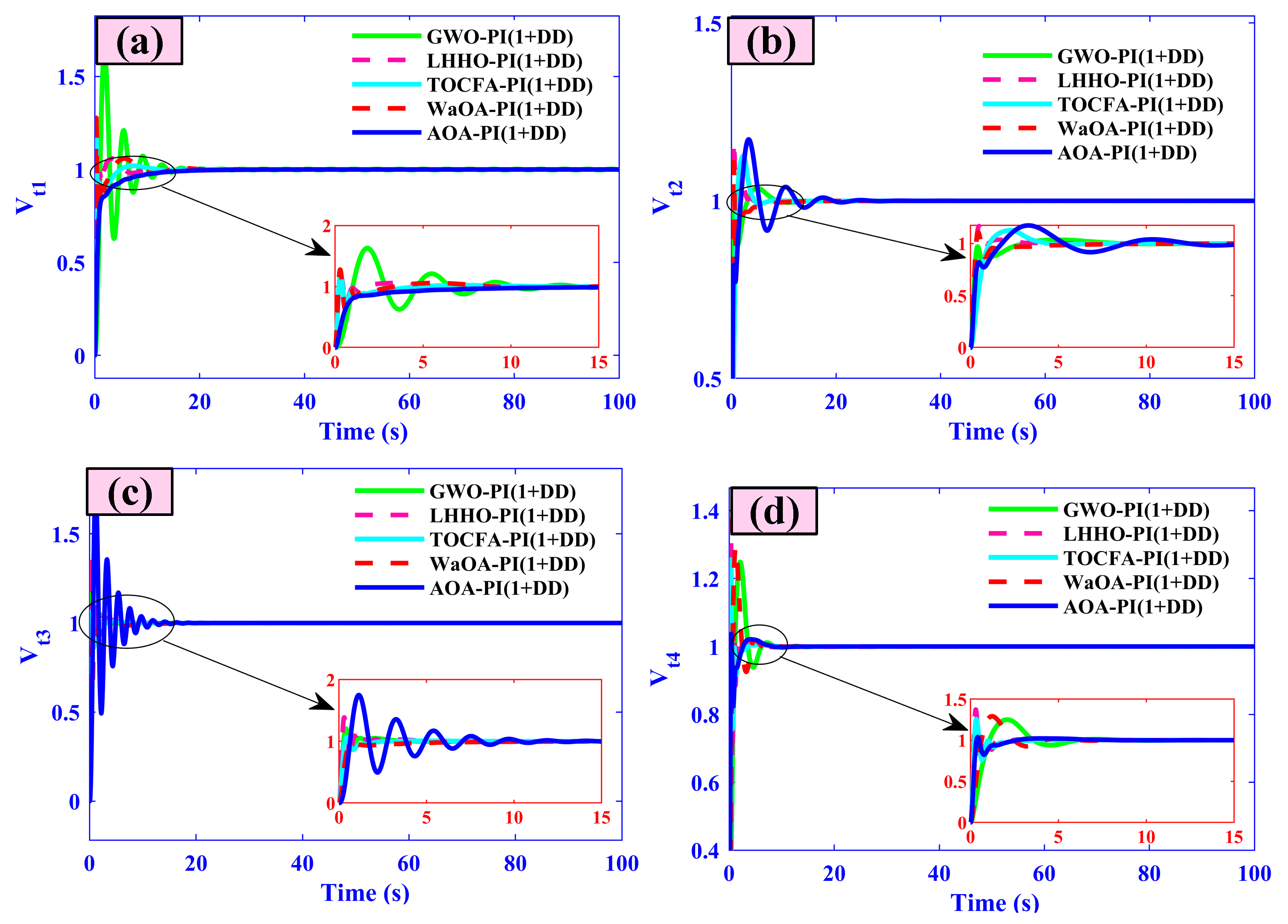 In addition, while many recent variants of the PID controller, such as the BELBIC PID [53,54,55], Sigmoid PID [56,57], and Neuroendocrine PID controllers [58], have been developed to improve performance in complex systems, but they still encounter significant limitations in multi-area interconnected power systems. The BELBIC PID controller, for example, is effective in simple systems but may struggle with the nonlinearities and time-varying nature of modern power grids. Similarly, the Sigmoid PID and Neuroendocrine PID controllers, while effective in specific applications, may not offer the same level of robustness and adaptability required in power systems with high levels of renewable energy integration. The PI(1+DD) controller, optimized using the AOA, is particularly well-suited for these complex systems. Its ability to incorporate a derivative delay term helps mitigate overshoot and enhance transient stability, while the AOA optimization ensures that it can handle the nonlinear dynamics of RES more effectively. This makes the PI(1+DD) controller a more appropriate choice for the challenges of modern multi-area interconnected power systems, addressing the gaps left by other advanced PID variants.