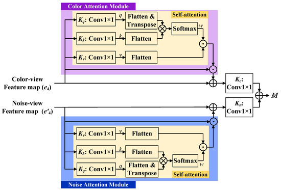 The features from the color view branch () and noise view branch () are separately enhanced by their corresponding attention modules ( and ). They are then weighted by convolution kernels (, ) and linearly combined, producing a more discriminative representation of forgery regions. Here, denotes the self-attention module, so and are defined in Equation (6):