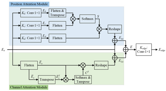 After completing the two attention modules, the feature maps and are added together to obtain the final map . And then, the edge prediction result is obtained using a convolution kernel for feature graph E.