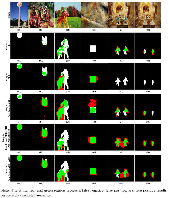 In Table 4, the forgery detection performance of different models is evaluated using multiple datasets at the pixel level. Regarding evaluation metrics, we adopted the F1 score of Pixel-Level Detection Metrics, where the best result on each dataset is highlighted with bold font. Meanwhile, using the mean value of F1 scores of six datasets, labeled as Mean, to comprehensively evaluate the overall performance of the model.
