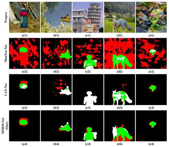 The examples of detection results using ManTra-Net, CAT-Net and MMFD-Net. (a1–e1) is the detected forged images; (a2–e2) is the detected results of ManTra-Net, in corresponding to (a1–e1); (a3–e3) is the detected results of CAT-Net, in corresponding to (a1–e1); (a4–e4) is the detected results of MMFD-Net, in corresponding to (a1–e1).