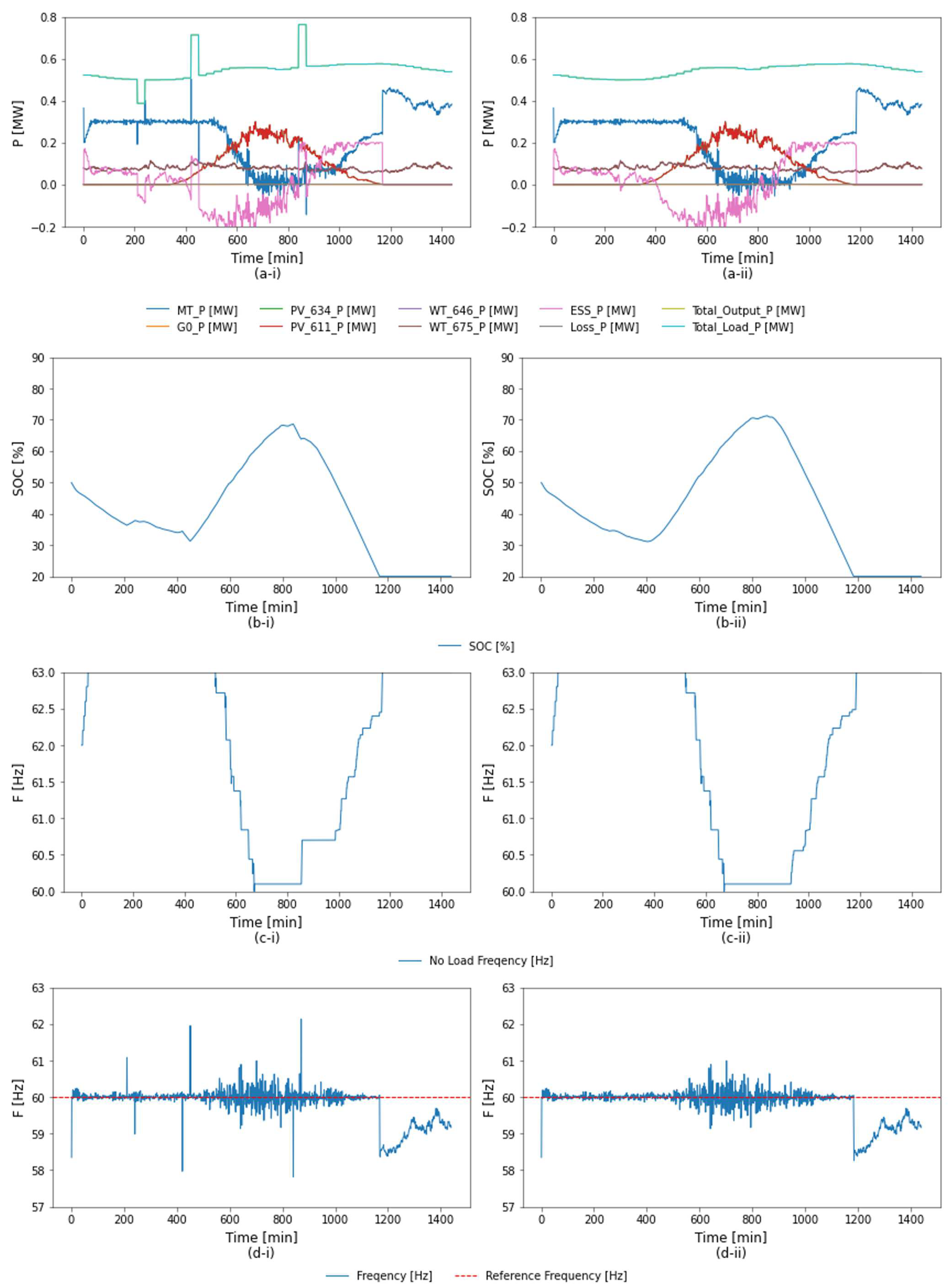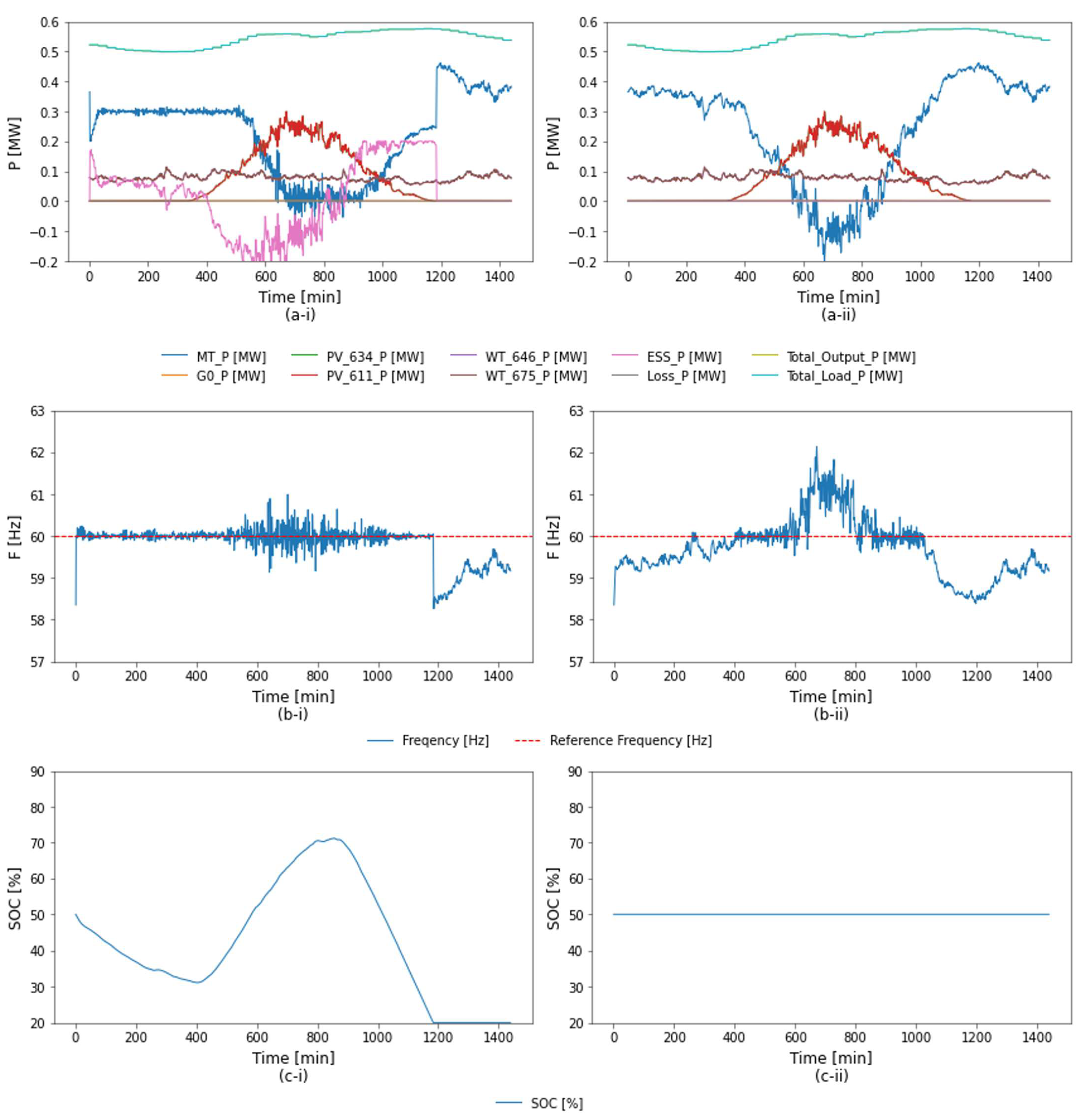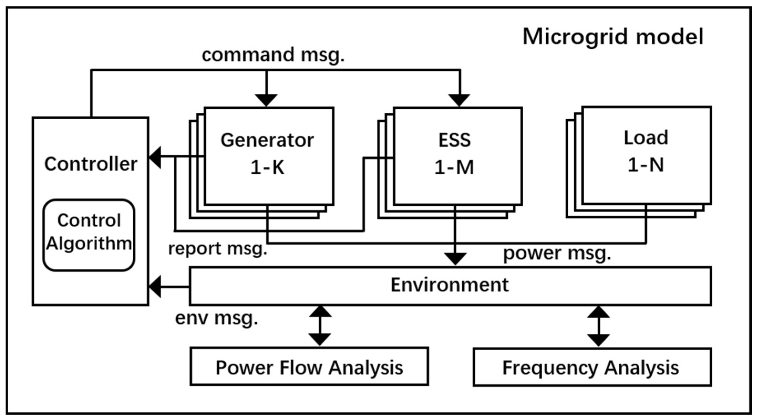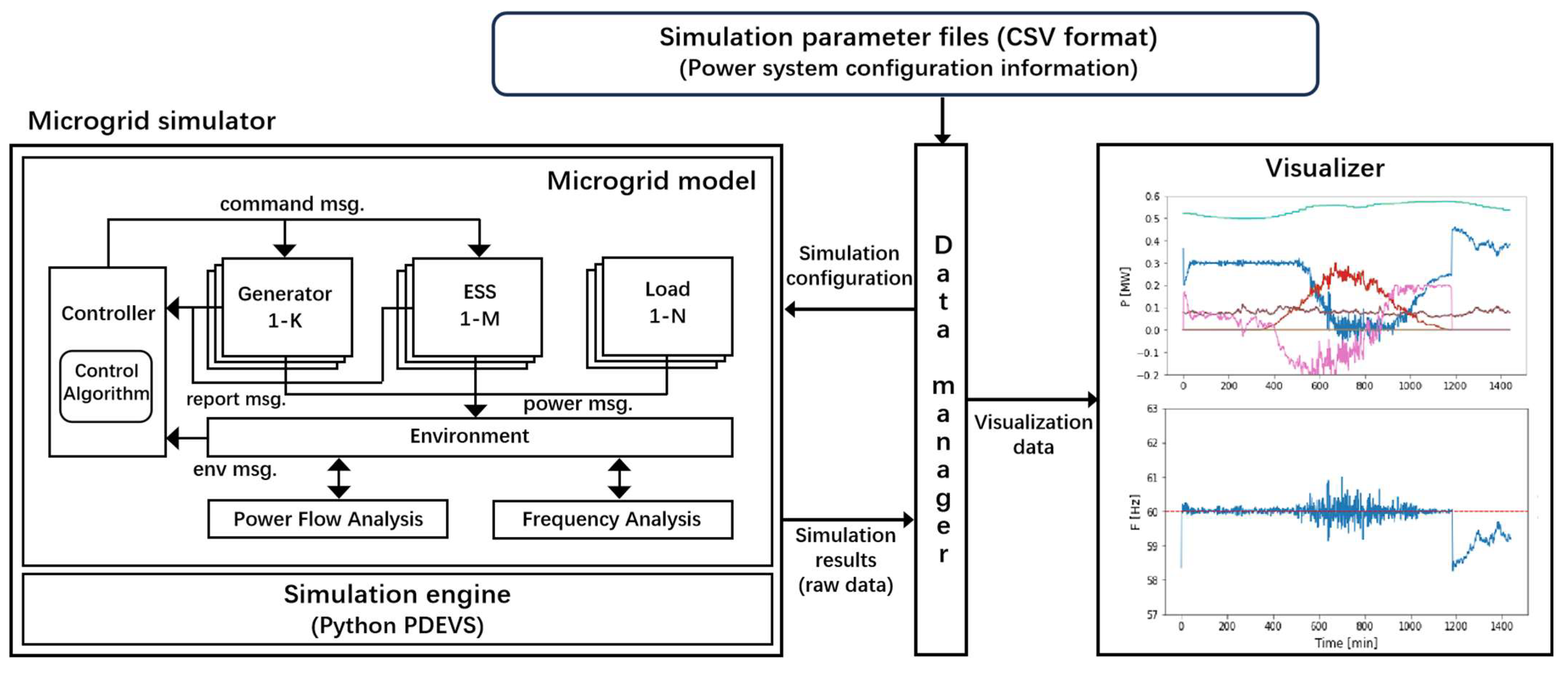 - Multiple frequency regulation strategies—including ESS scheduling, Automatic Generation Control (AGC), and Predictive Automatic Generation Control (PAGC)—are integrated into the model, enabling systematic verification of diverse control strategies within the microgrid framework. Importantly, the framework offers high extensibility, allowing additional control strategies to be incorporated and tested in future applications by simply modifying the corresponding Python files (Python 3.7).