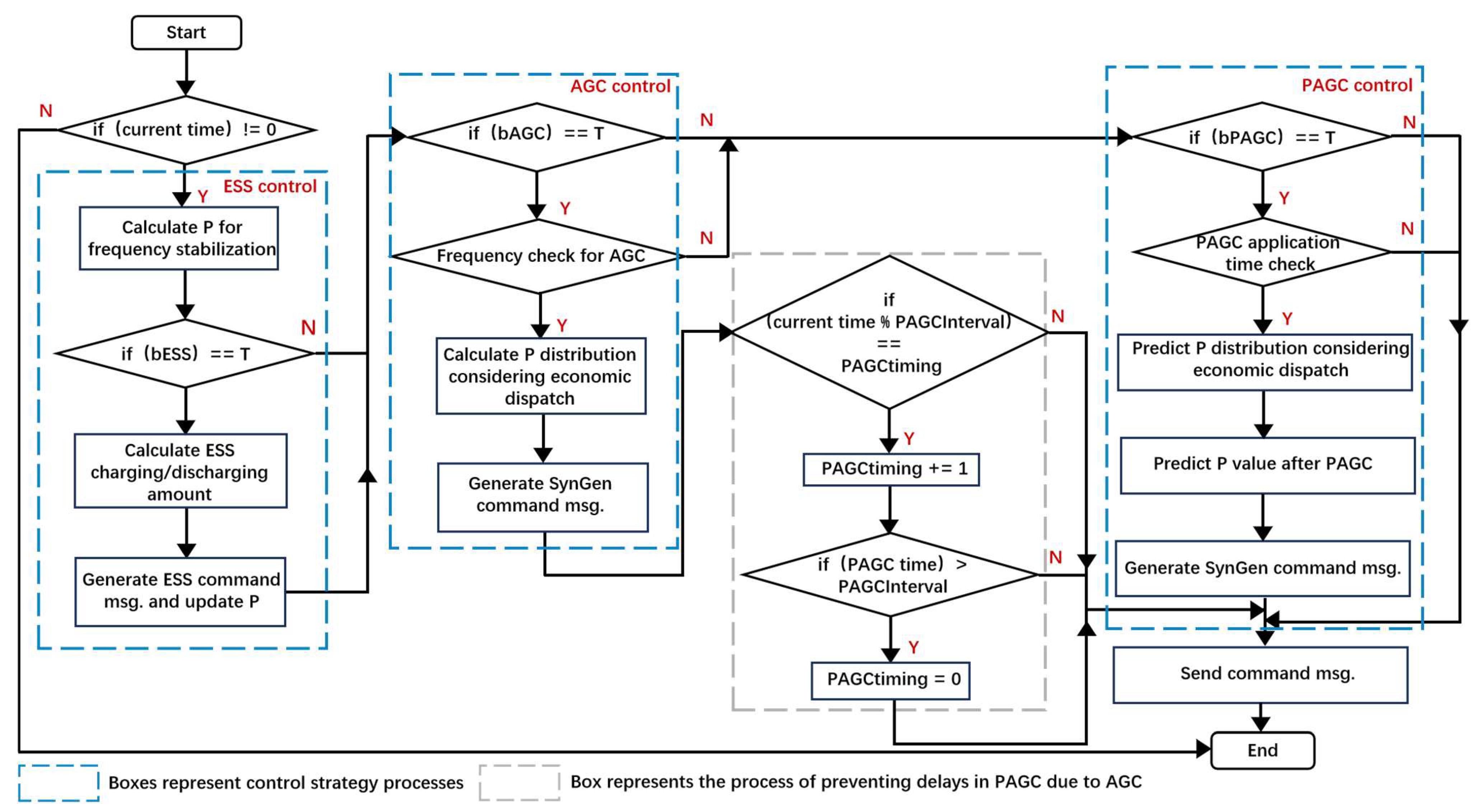 | Control algorithm | An algorithm that distributes active power load among synchronous generators, considering refined dispatch based on the usage of ESS, AGC, and PAGC. | For AGC: distributes based on current active power required by synchronous generators. For PAGC: distributes based on projected active power required after PAGC interval time. |