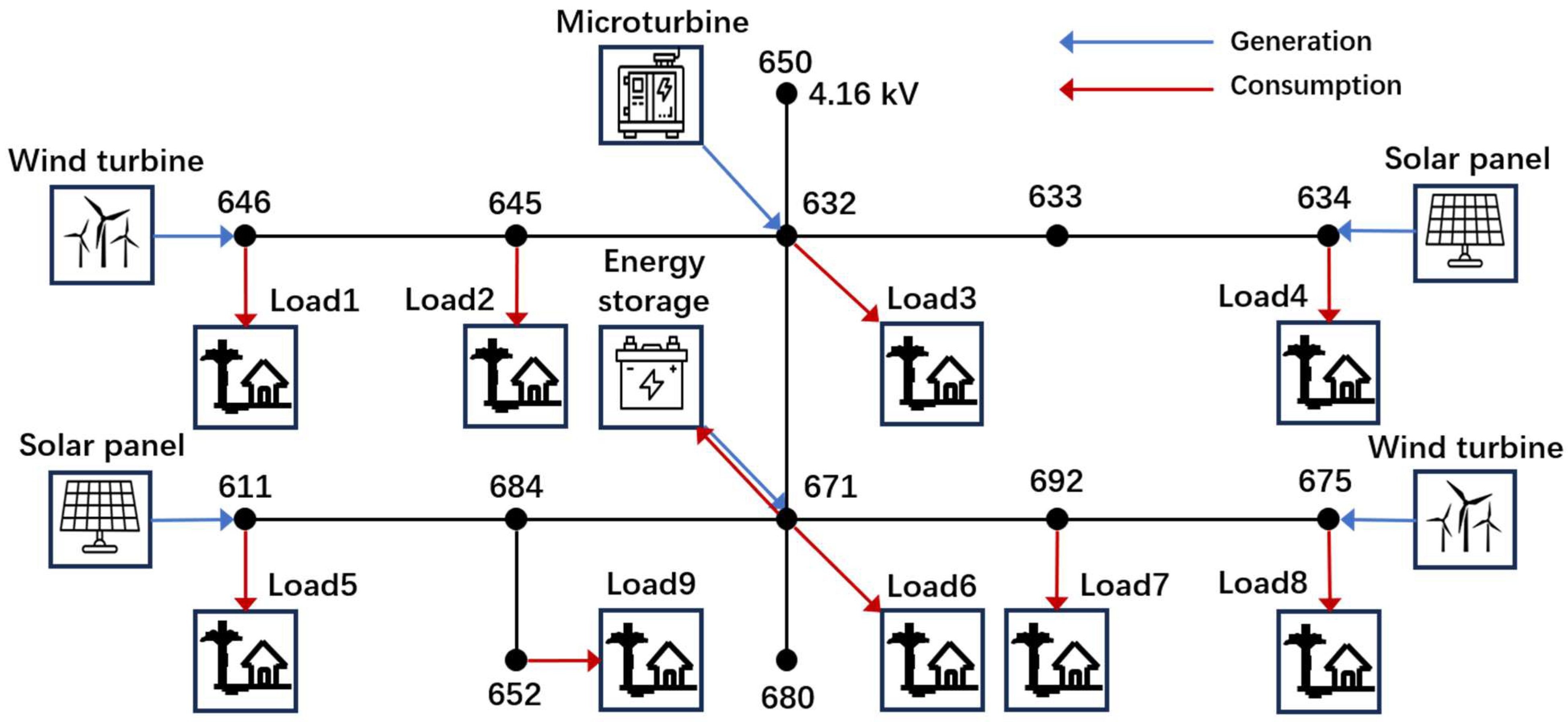- Schneider, K.P.; Mather, B.A.; Pal, B.C.; Ten, C.-W.; Shirek, G.J.; Zhu, H.; Fuller, J.C.; Pereira, J.L.R.; Ochoa, L.F.; de Araujo, L.R.; et al. Analytic considerations and design basis for the IEEE distribution test feeders. IEEE Trans. Power Syst. 2018, 33, 3181–3188. [Google Scholar] [CrossRef]