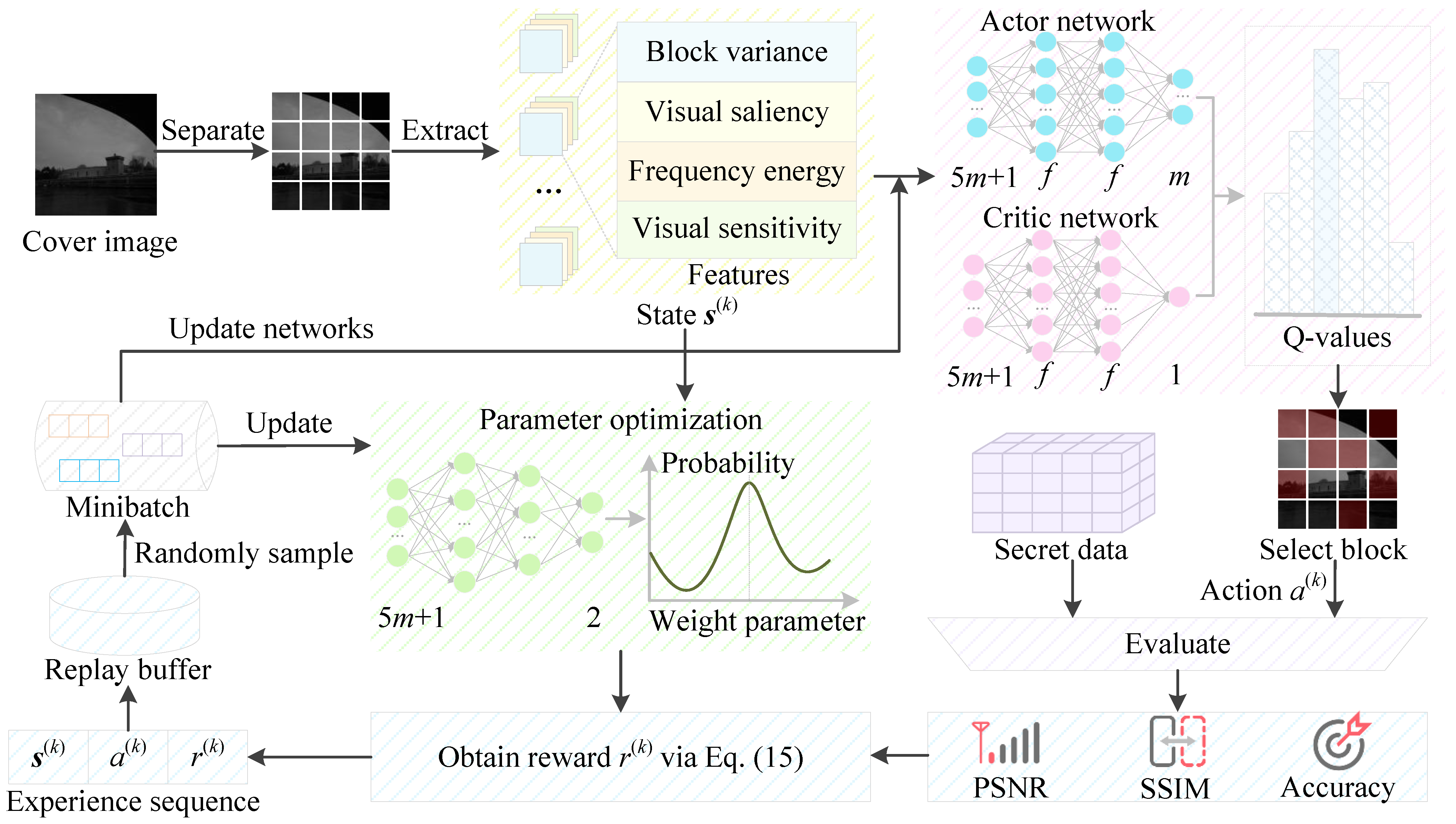 In this framework, the agent only receives a reward signal when an entire embedding episode is completed, which means that all secret bits are embedded. The reward at step k is computed based on the quality and security of the resulting stego image, evaluated using three metrics: peak signal-to-noise ratio (PSNR) , structural similarity index (SSIM) , and detection accuracy .