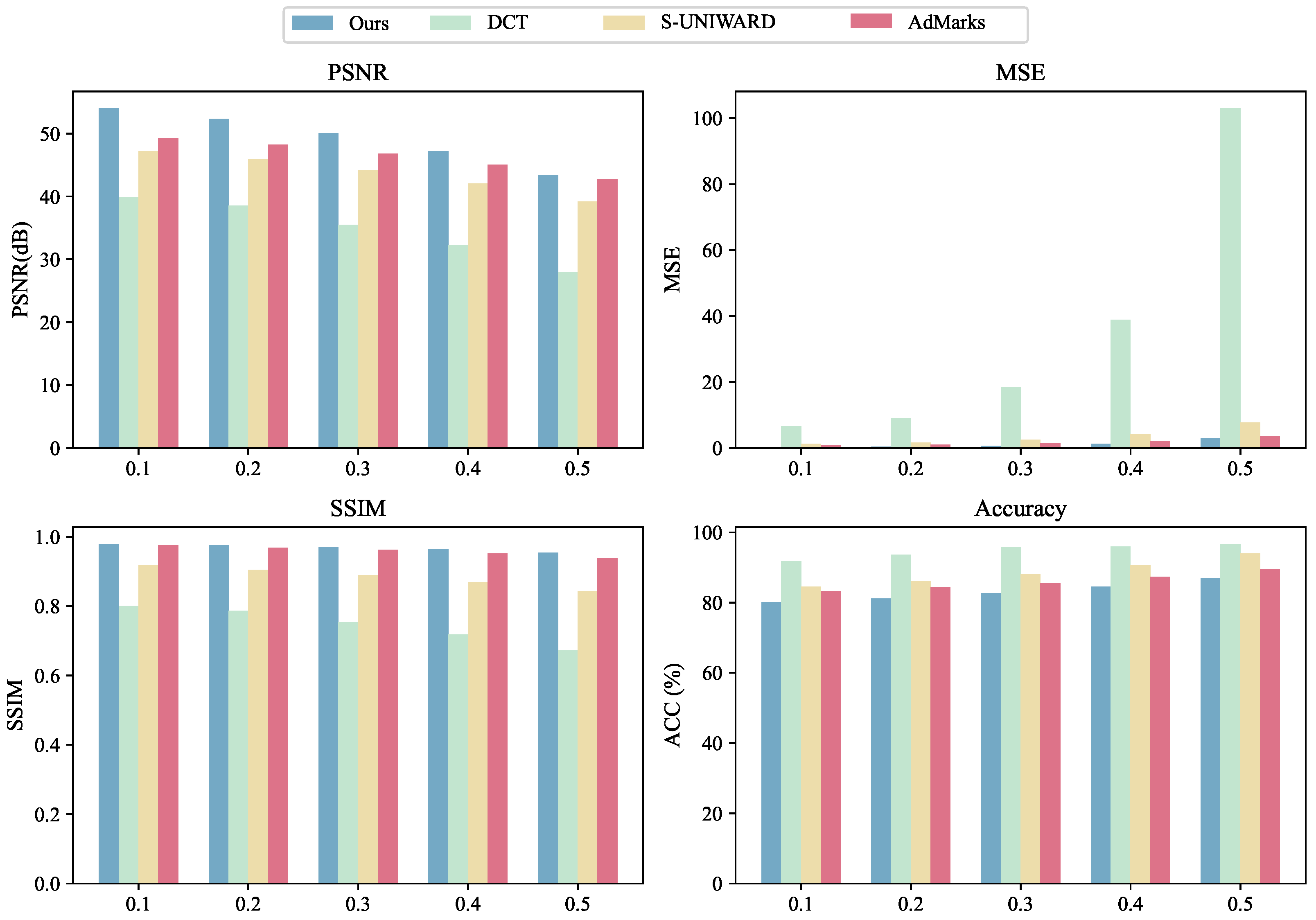 Figure 5. PSNR, MSE, and SSIM are widely adopted to measure the visual fidelity of stego images, whereas ACC (classification accuracy of the steganalyzer) evaluates the detectability of hidden data. Together, these metrics provide a comprehensive view of both imperceptibility and security.
