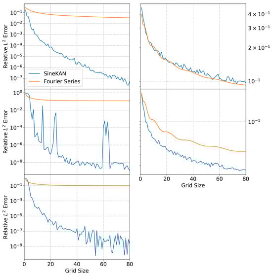 Results for 1D functions are shown in Figure 1. For (19)–(21), the SineKAN approximation significantly outperforms the Fourier series approximation. In (22), performance is roughly comparable between the two. We observe that the function in (22) has less regularity, which causes both the SineKAN and the Fourier series to converge slowly.