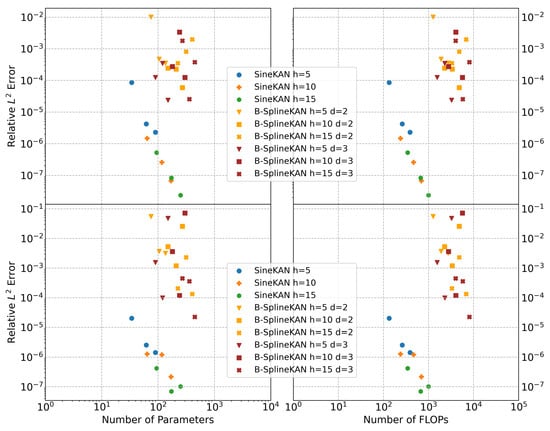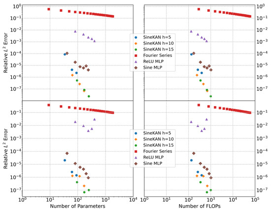 We also computed performance as a function of the number of relative FLOPs or compute units. To do this calculation, we ran 10 million iterations using numpy arrays of size 1024 to estimate the relative compute time of addition, multiplication, ReLU, and sine; we found that, when setting addition and multiplication to approximately 1 FLOP, ReLU costs an estimated 1.5 FLOPs, and sine functions cost 12 FLOPs. We carried out similar estimates in PyTorch (https://pytorch.org/, accessed on 15 September 2025) and found that the relative FLOPs for sine would be closer to 3.5 in PyTorch, and the relative FLOPs for ReLU would be around 1 FLOP. Figure 2 is based on numpy estimates.