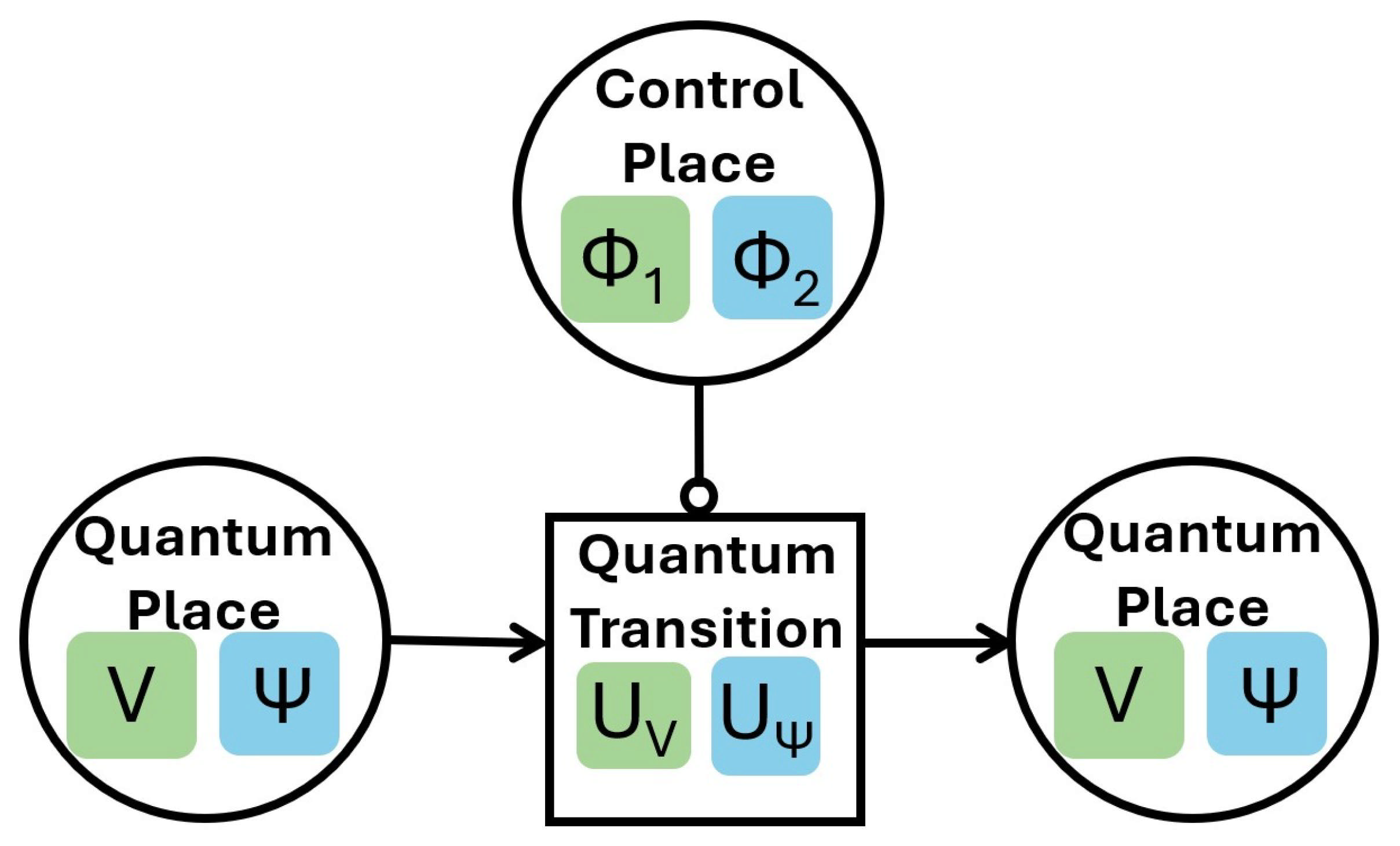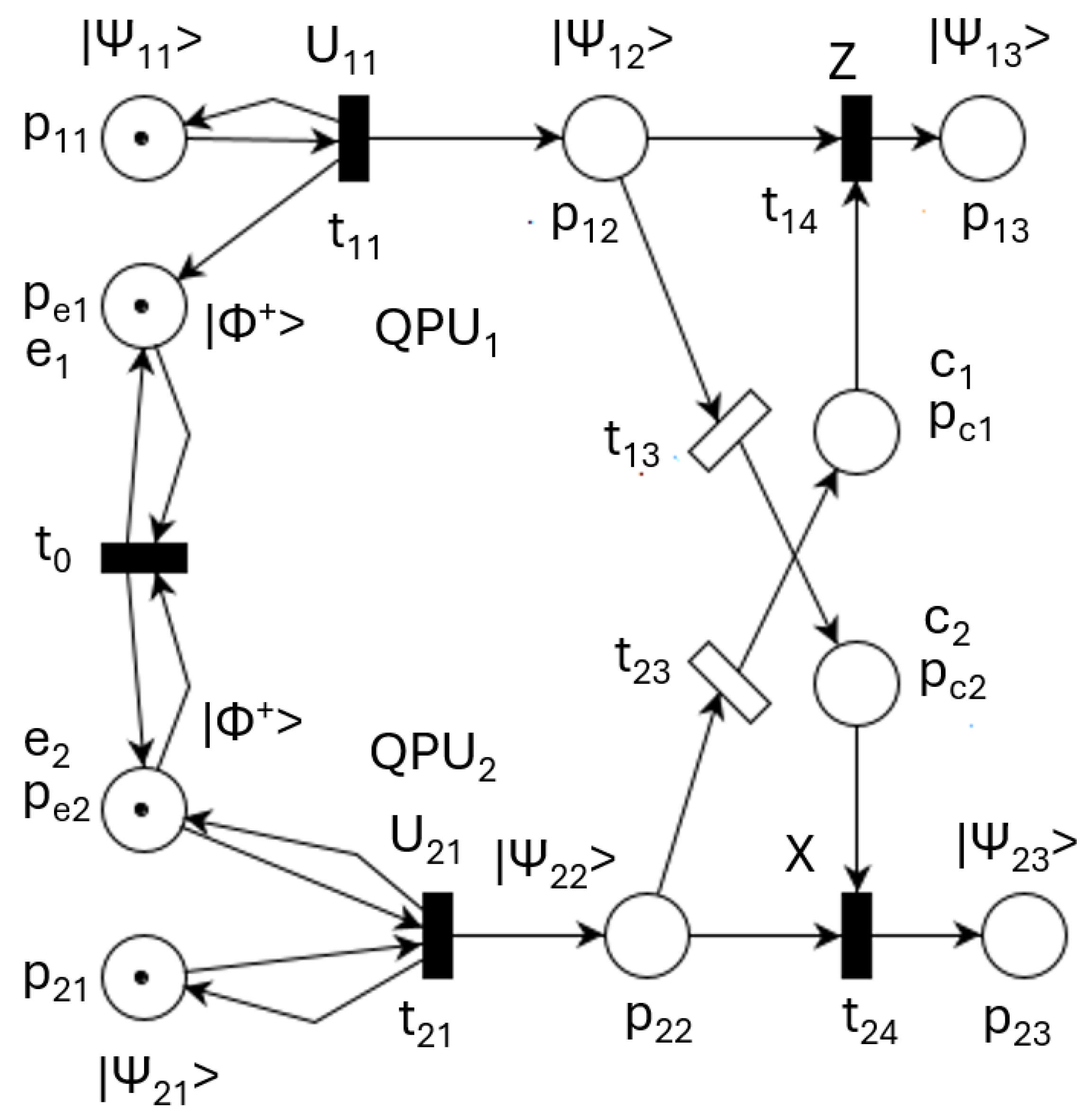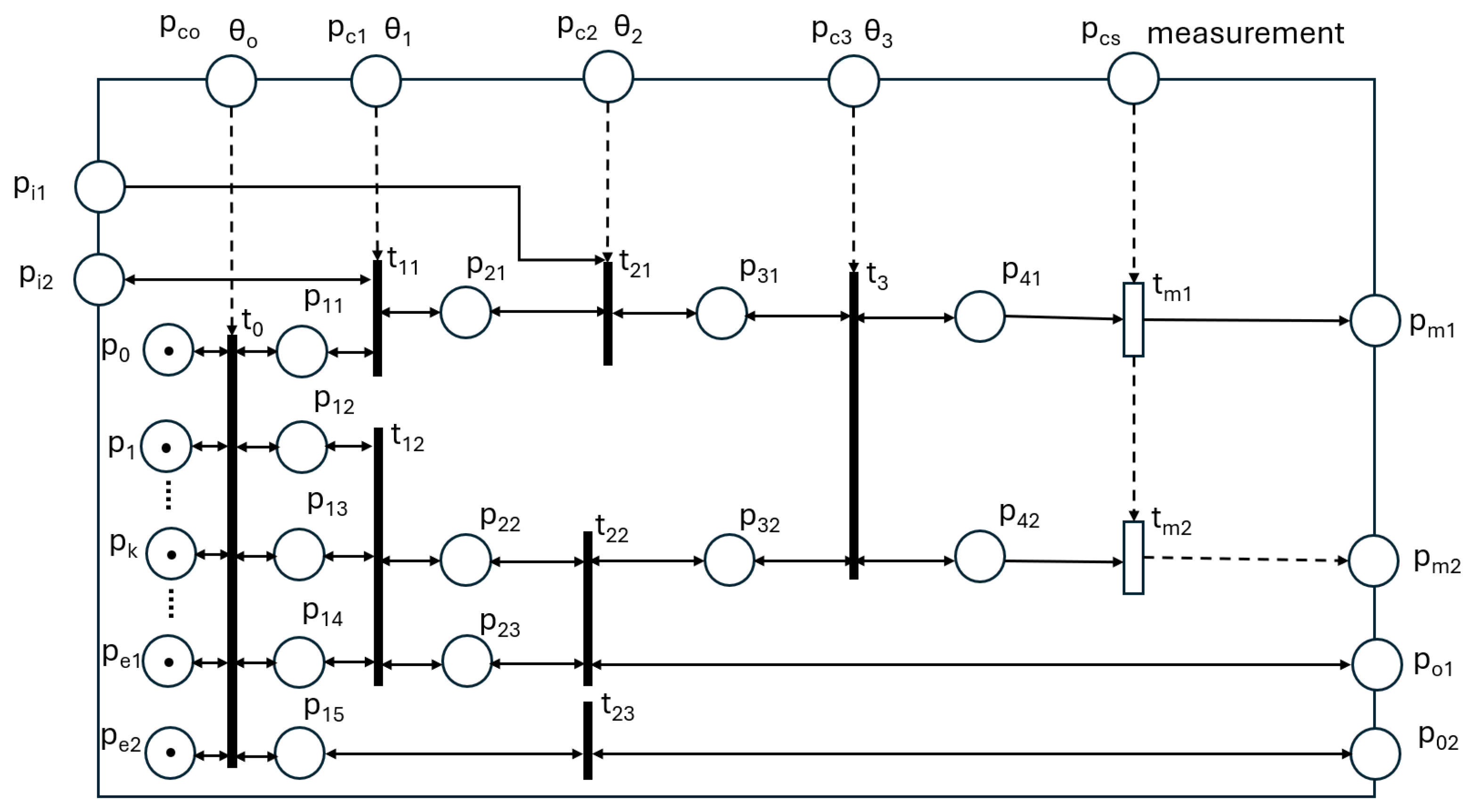 Some of these inputs are used by controlled transition (modeling phase 1), while the other four are used by transition (phase 2). Both phases are controlled by places and , which store the control qubit . Transition models the four exit flows. These are measured by transition and sent out through transition via place .
