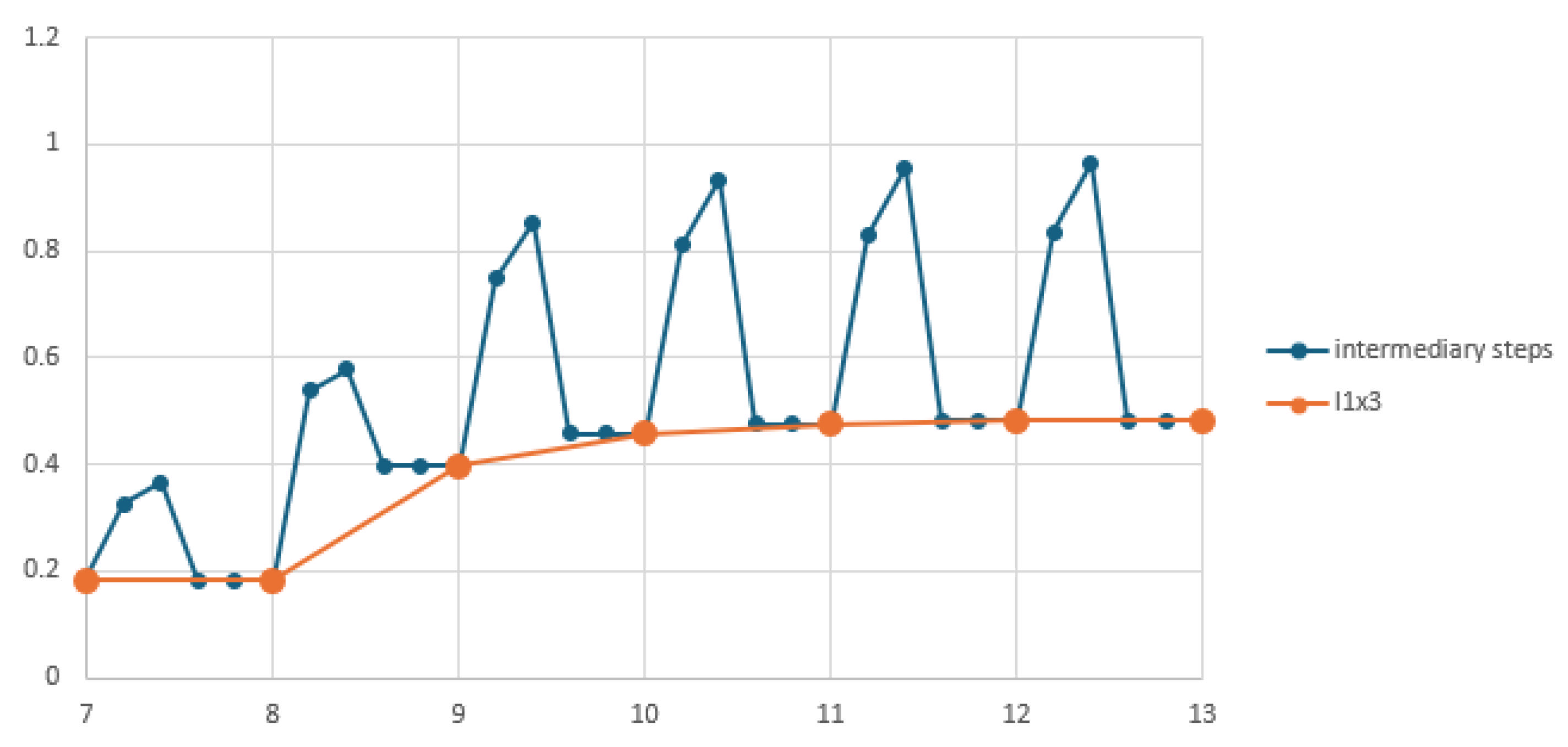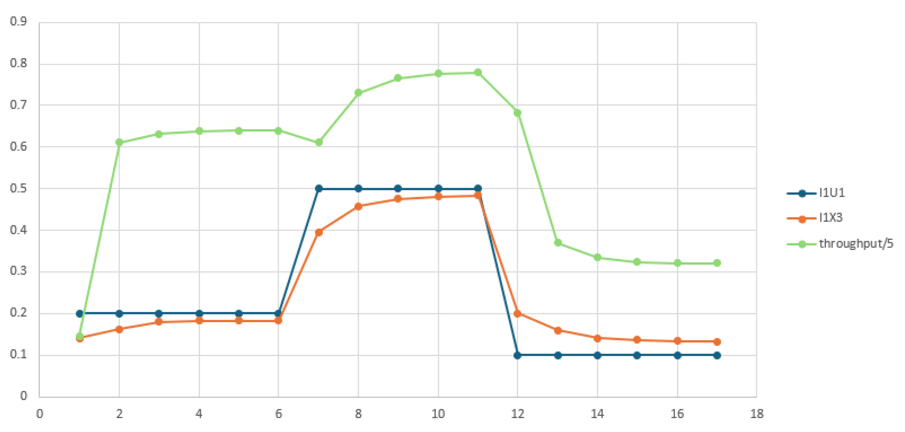 Figure 25 shows the evolution of the controlled UVTS: blue for input evolution, orange for lane flow evolution, and green for throughput. UVTS throughput was divided by 5 to use the same vertical axis.
