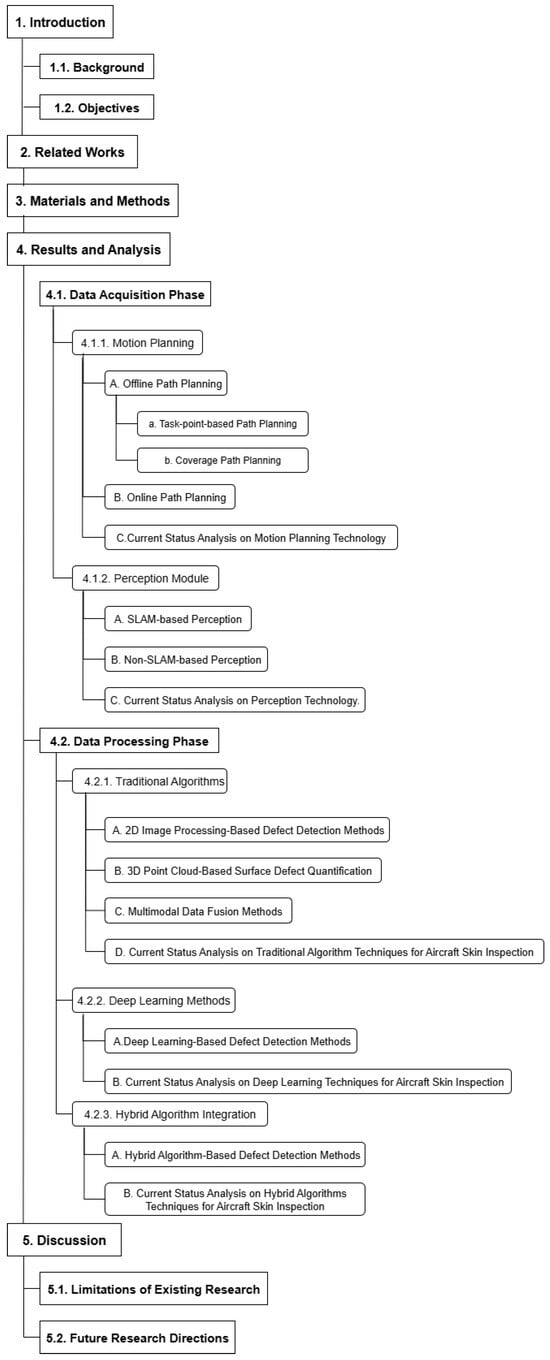 By addressing these questions, this review aims to provide a comprehensive overview that serves as a foundational reference for accelerating the development of robust, efficient, and reliable automated inspection systems in aviation maintenance. The structure of this paper is illustrated in Figure 1.