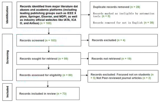 This review was carried out in accordance with the PRISMA 2020 statement, an updated guideline for reporting systematic reviews, to ensure methodological rigor and transparent documentation of the review process [14]. The literature screening process, as illustrated in Figure 2, followed a rigorous multi-stage methodology. Initially, 169 records were identified through a systematic search across eight academic databases: ACM Digital Library, CiteSeerX, Emerald Insight, IEEE Xplore, Sage, ScienceDirect, SPIE Digital Library, and Wiley Online Library. Additionally, a separate search for industry reports and standards was conducted on the official websites of IATA, ICAO, and Airbus. Search strings were constructed based on the research questions, with several trials conducted to optimize keyword combinations and variations. The primary search string used was as follows: (aircraft OR airplane) AND (visual OR vision OR image) AND (“inspection” OR “maintenance” OR “surface scan”) AND (“path planning” OR “route planning” OR “autonomous navigation”) AND (inspection OR analysis OR evaluation OR detection OR verification). After removing 28 duplicate records and 38 non-English publications, 103 records underwent full-text evaluation. Ultimately, 73 high-quality publications were included, forming the core literature corpus for this systematic review. This meticulous selection process ensures the academic rigor and comprehensiveness of our analysis. Stringent inclusion criteria, as detailed in Table 1, were strictly applied during the literature screening process. These criteria ensured the representativeness of the selected studies in terms of technical themes, methodological innovations, and temporal coverage, thereby facilitating a systematic analysis of the developmental trajectory of robotic technologies for aircraft surface inspection.