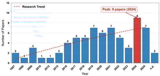 Temporal distribution of 73 robotic aircraft skin inspection-related publications (1997–2025).