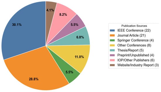 As illustrated in Figure 3, the selected publications span the period from 1997 to 2025, with a peak of 9 papers in 2024. The period from 2024 to 2025 shows sustained high productivity, with 7–9 papers published annually. This range encompasses both foundational coverage–path-planning studies from earlier years and recent AI-driven advances since 2020, ensuring theoretical continuity and comprehensive coverage of the field’s evolution. As illustrated in Figure 4, the literature source distribution analysis reveals that the IEEE Conference constitutes the largest proportion at 30.1%, followed by journal articles at 28.8%. Other conferences account for 11.0%, while IOP/other publishers represent 8.2%. Theses/reports comprise 6.8%, and both the Springer Conference and preprint/unpublished each make up 5.5%. Website/industry reports account for the smallest share at 4.1%.