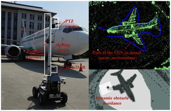 Figure 5. A UGV for aircraft skin inspection (developed by our team at the Civil Aviation University of China) with a motion planning function based on A* and TEB algorithms. Source: authors.To this end, in their subsequent work [22], Piao et al. further proposed a Bézier curve-based path planning method specifically addressing the motion safety issue of the UGV caused by its elevated center of gravity due to the lifting mechanism. Building upon the previously generated viewpoints, this method employs Sequential Quadratic Programming (SQP) to optimize and generate a smooth path that satisfies curvature constraints and obstacle avoidance requirements, effectively preventing the risk of the UGV tipping over during motion. Thereby, it achieves a fully automated end-to-end coverage inspection process from viewpoint generation to path execution.Nevertheless, in the aforementioned “first-sample-then-connect” approach, path quality heavily depends on the distribution and density of the viewpoint set. In stark contrast, Tong et al. [23] pioneered a fundamentally different continuous coverage path planning method based on 3D mesh parameterization. This approach abandons the discrete viewpoint sampling paradigm altogether. Instead, it parameterizes and maps the 3D model of the aircraft skin onto a 2D plane, directly generating a continuous, collision-free Boustrophedon scanning path within this 2D domain, and then transforms it back into 3D space via barycentric coordinate mapping. Its primary advantage lies in its inherent ability to guarantee extreme consistency in observation distance and angle throughout the scanning process, thereby providing subsequent damage detection algorithms with highly uniform image data. Simulations demonstrate that this method achieves coverage rates as high as 94% on complex surfaces, with a significantly lower standard deviation in observation distance compared to sampling-based methods. However, the trade-off is its heavy reliance on predefined high-precision 3D models. Furthermore, the entire planning process is conducted offline, lacking the capability for real-time adjustments in response to dynamic environmental changes. The optimality of the path and computational efficiency are also constrained by the distortion inherent in the parameterization process.Consequently, current research in high-quality coverage path planning presents two parallel technical pathways: “discrete viewpoint optimization” and “continuous path parameterization”. The former offers greater flexibility but results in less coherent paths, while the latter ensures superior data consistency at the cost of weaker environmental adaptability. Integrating the strengths of both approaches represents a key focus for future research.In scenarios with extremely high efficiency requirements, such as pre-flight walk-around inspections, the rapidity of path planning is crucial. Although quality-oriented path planning can collect high-quality data and provide a solid foundation for subsequent high inspection accuracy, efficiency is equally important in such contexts. Therefore, some researchers have focused on improving efficiency, primarily through two approaches: optimizing path length and reducing algorithm runtime, with the goal of achieving more efficient inspections.Some research concentrates on optimizing path length to improve task execution efficiency. For example, Cao et al. [24] proposed a hierarchical multi-resolution coverage path planning framework for UAV platforms. Based on octree-based spatial partitioning and two-level Traveling Salesman Problem (TSP) optimization, this framework significantly shortens the coverage path length in complex 3D structured environments by decoupling the planning of subspace sequences at the global scale from viewpoint path planning at the local scale.Some research, on the other hand, focuses on reducing algorithm runtime to enhance efficiency. For example, Tappe et al. [25] integrated point cloud downsampling with an enhanced Genetic Algorithm (GA) based on the open-path Traveling Salesman Problem (TSP), successfully reducing path planning time to 90 s. Simulation results demonstrate that this approach achieves complete coverage of an Airbus A320 surface within 60 min. Meanwhile, Almadhoun et al. [26] proposed a GPU-accelerated coverage path planning method for UAV platforms. This method, combining a heuristic reward function with CUDA parallelization techniques, significantly improves the efficiency of key computational steps such as frustum culling and occlusion culling.In aircraft skin inspection tasks, both efficiency and quality are core optimization objectives. Unlike the aforementioned studies that solely focus on a single objective, some researchers are dedicated to the collaborative optimization of quality and efficiency, and on this basis, conduct path planning. Almadhoun et al. [27] developed Adaptive Sampling-based Coverage Path Planning (ASSCPP), which combines multi-resolution octree entropy optimization with graph search strategies. This approach significantly reduces path length while achieving 98% coverage. The following year, the team further enhanced performance by refining aspects like heuristic functions, proposing the SSCPP algorithm [28].Specifically, Liu et al. [29] proposed the Quality-Efficiency Coupled Iterative Coverage Path Planning (QECI-CPP) method. This method employs a subspace processing strategy with differential constraints for narrow/normal spaces and quality-guided non-random initialization to generate inspection paths that simultaneously optimize image resolution, orthogonality, and path efficiency. Additionally, by introducing a weight-adjustable objective function, this method allows users to dynamically adjust the trade-off between inspection quality and execution efficiency according to specific task requirements, thereby significantly enhancing the applicability and flexibility of the algorithm across
